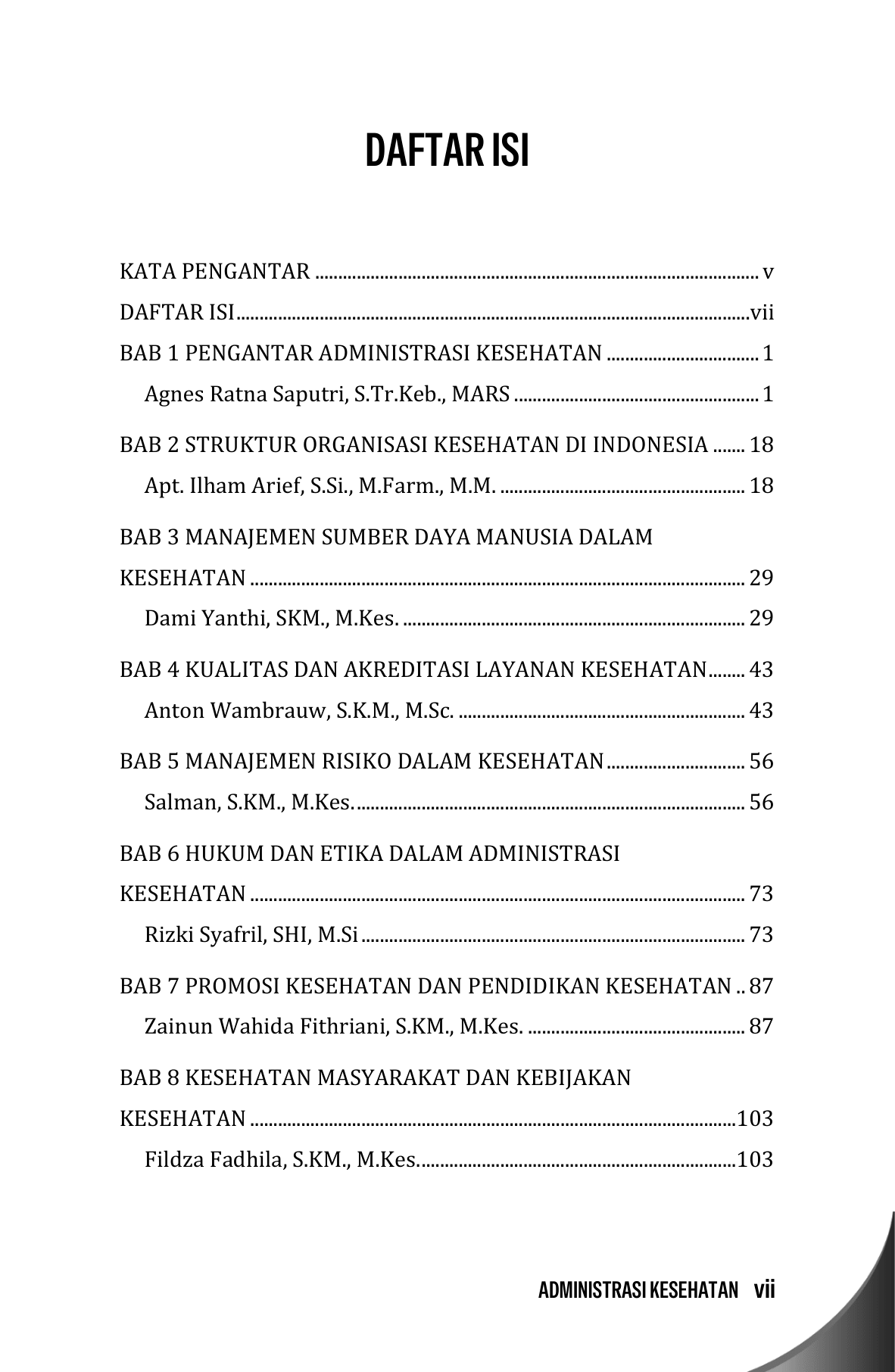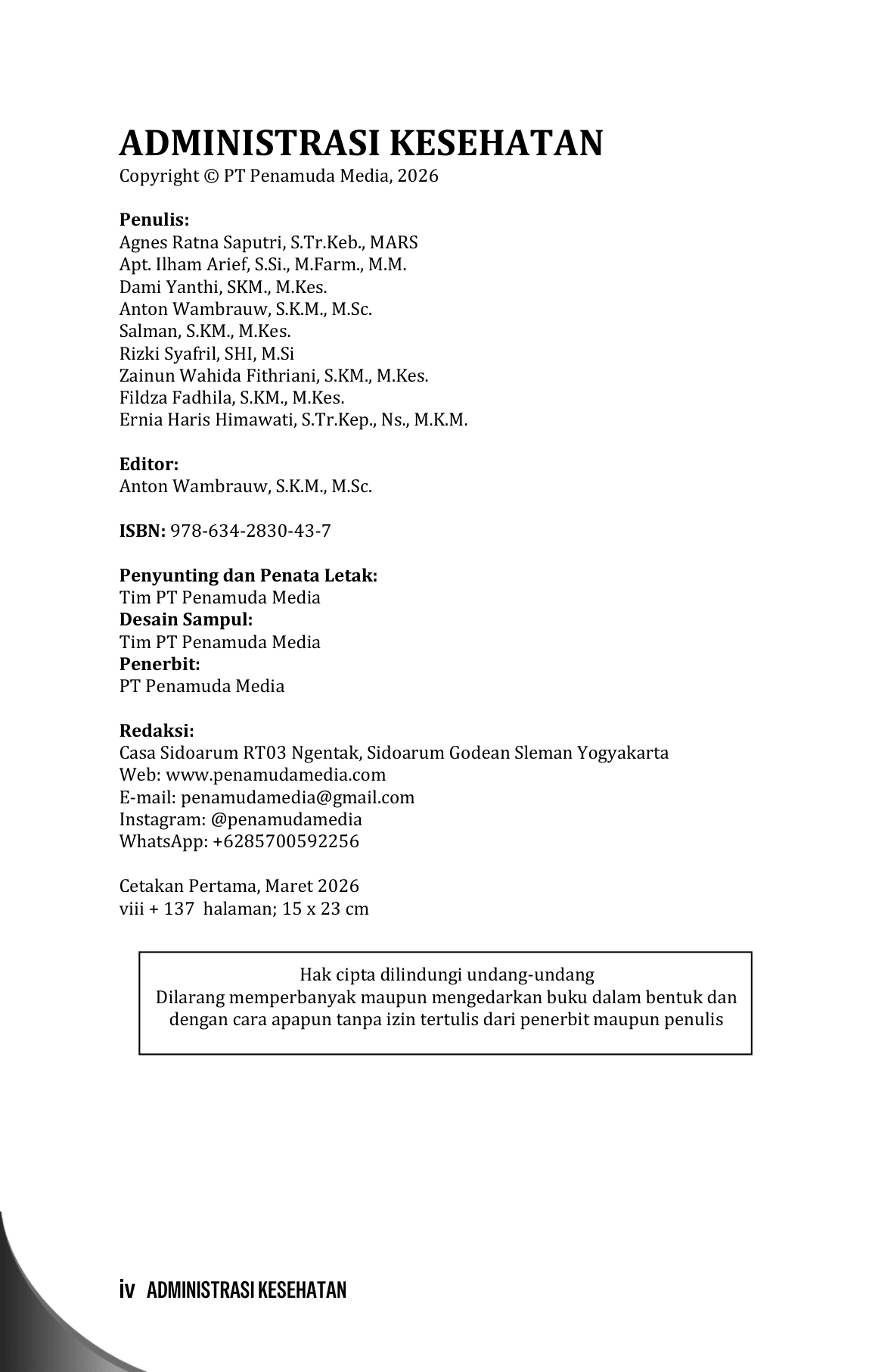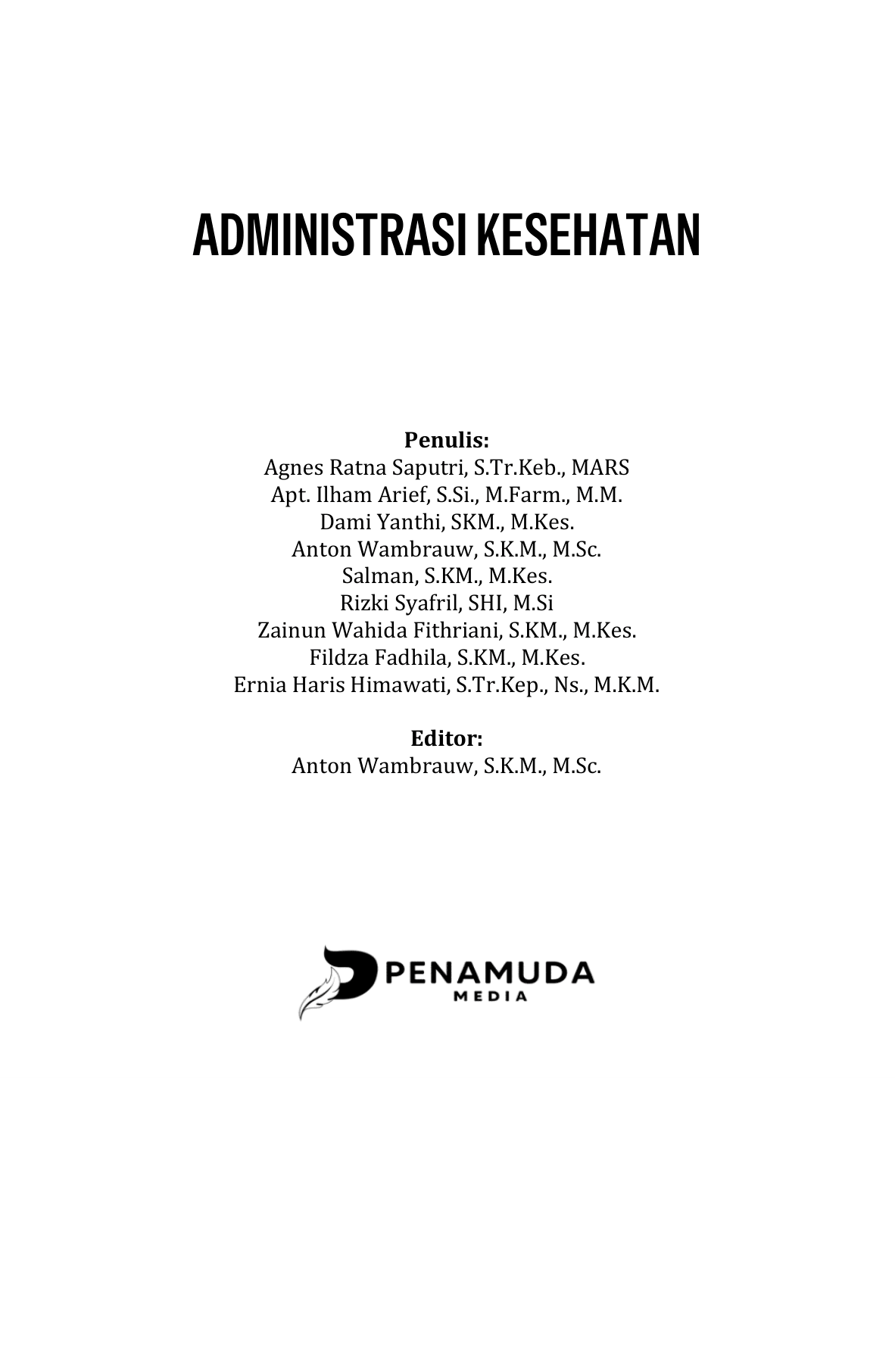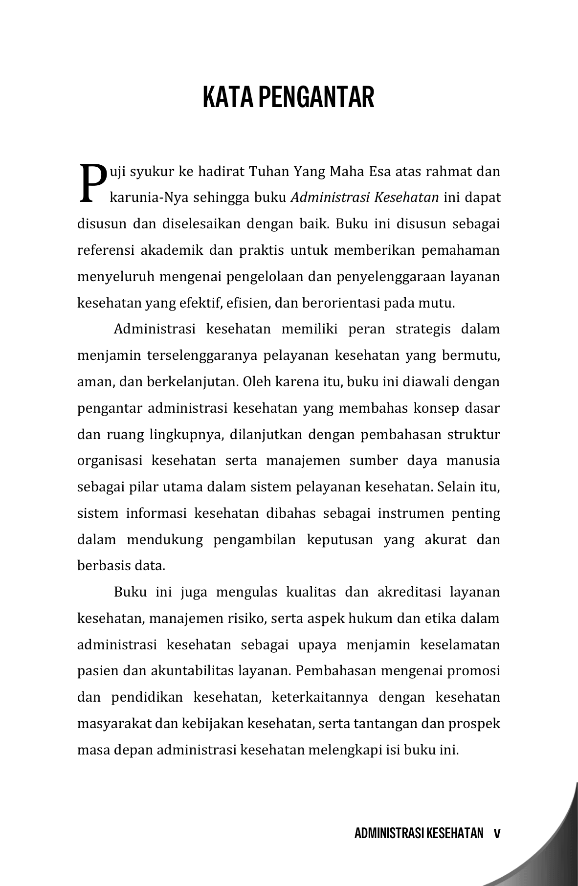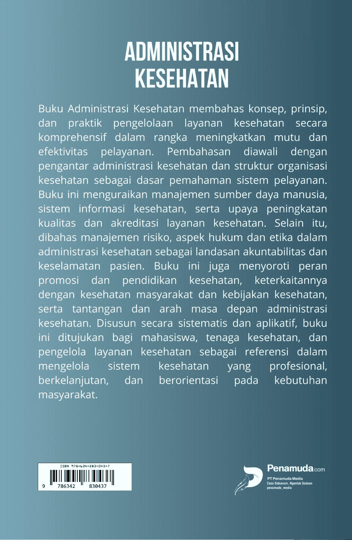 Buku Administrasi Kesehatan membahas konsep, prinsip, dan praktik pengelolaan layanan kesehatan secara komprehensif dalam rangka meningkatkan mutu dan efektivitas pelayanan. Pembahasan diawali dengan pengantar administrasi kesehatan dan struktur organisasi kesehatan sebagai dasar pemahaman sistem pelayanan. Buku ini menguraikan manajemen sumber daya manusia, sistem informasi kesehatan, serta upaya peningkatan kualitas dan akreditasi layanan kesehatan. Selain itu, dibahas manajemen risiko, aspek hukum dan etika dalam administrasi kesehatan sebagai landasan akuntabilitas dan keselamatan pasien. Buku ini juga menyoroti peran promosi dan pendidikan kesehatan, keterkaitannya dengan kesehatan masyarakat dan kebijakan kesehatan, serta tantangan dan arah masa depan administrasi kesehatan. Disusun secara sistematis dan aplikatif, buku ini ditujukan bagi mahasiswa, tenaga kesehatan, dan pengelola layanan kesehatan sebagai referensi dalam mengelola sistem kesehatan yang profesional, berkelanjutan, dan berorientasi pada kebutuhan masyarakat.