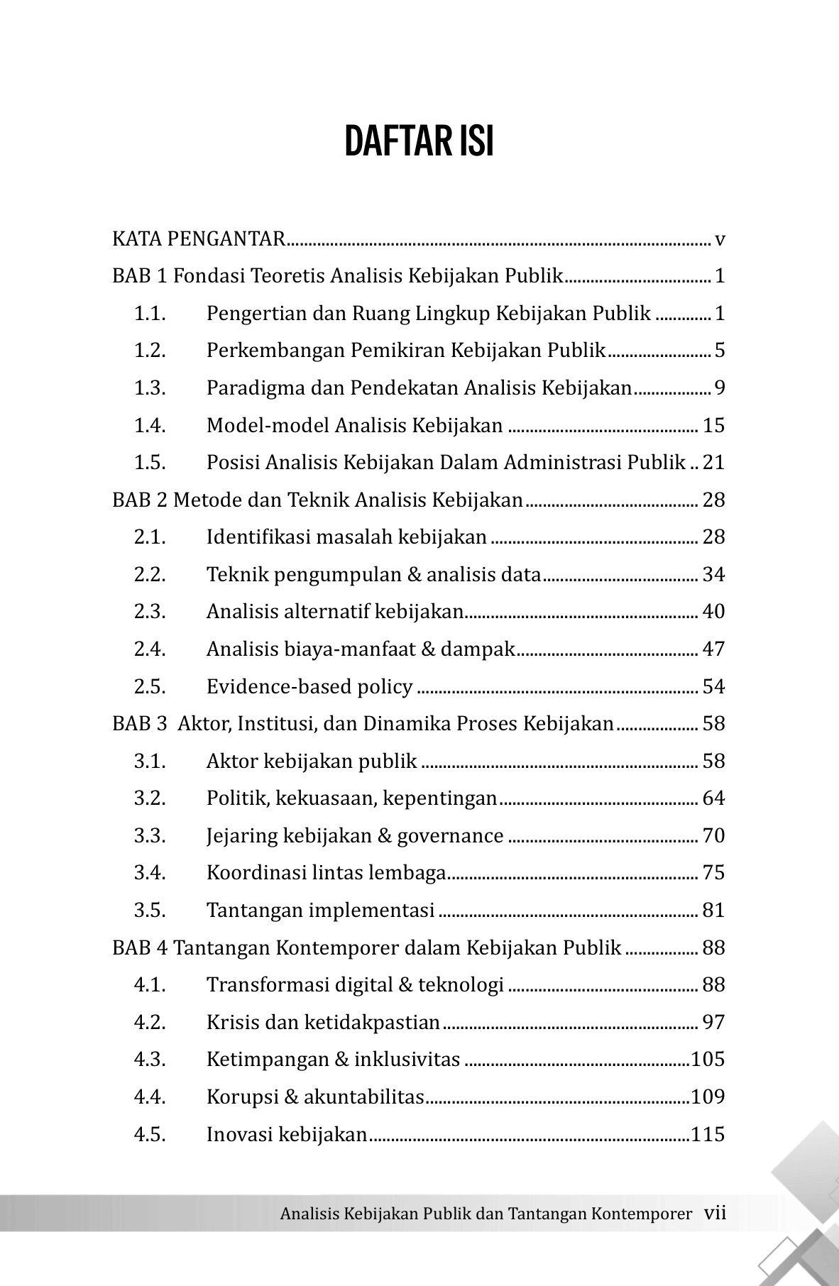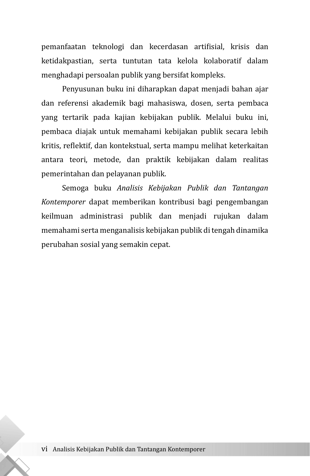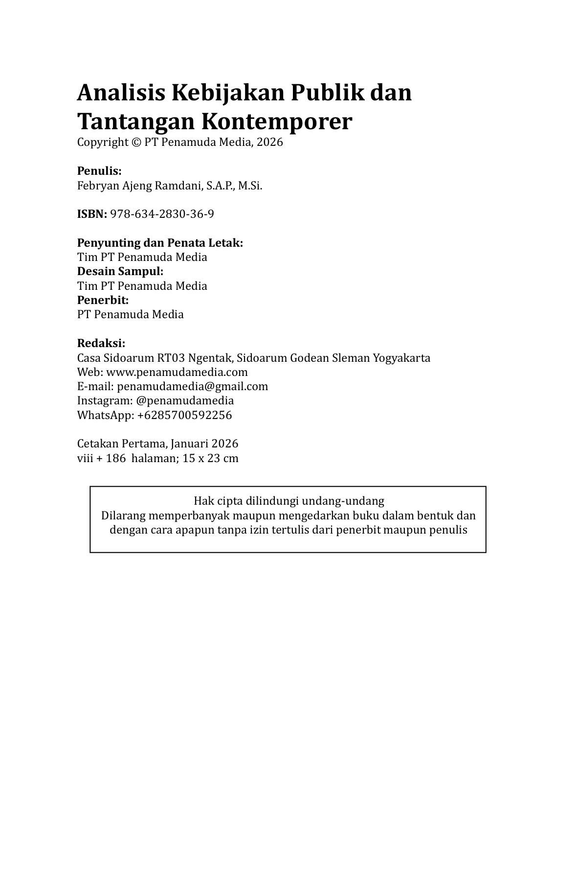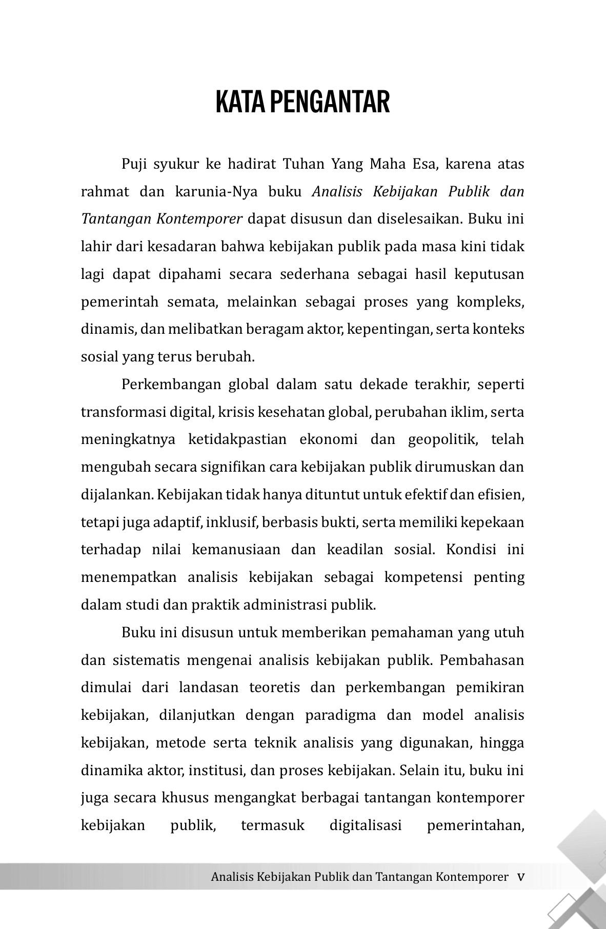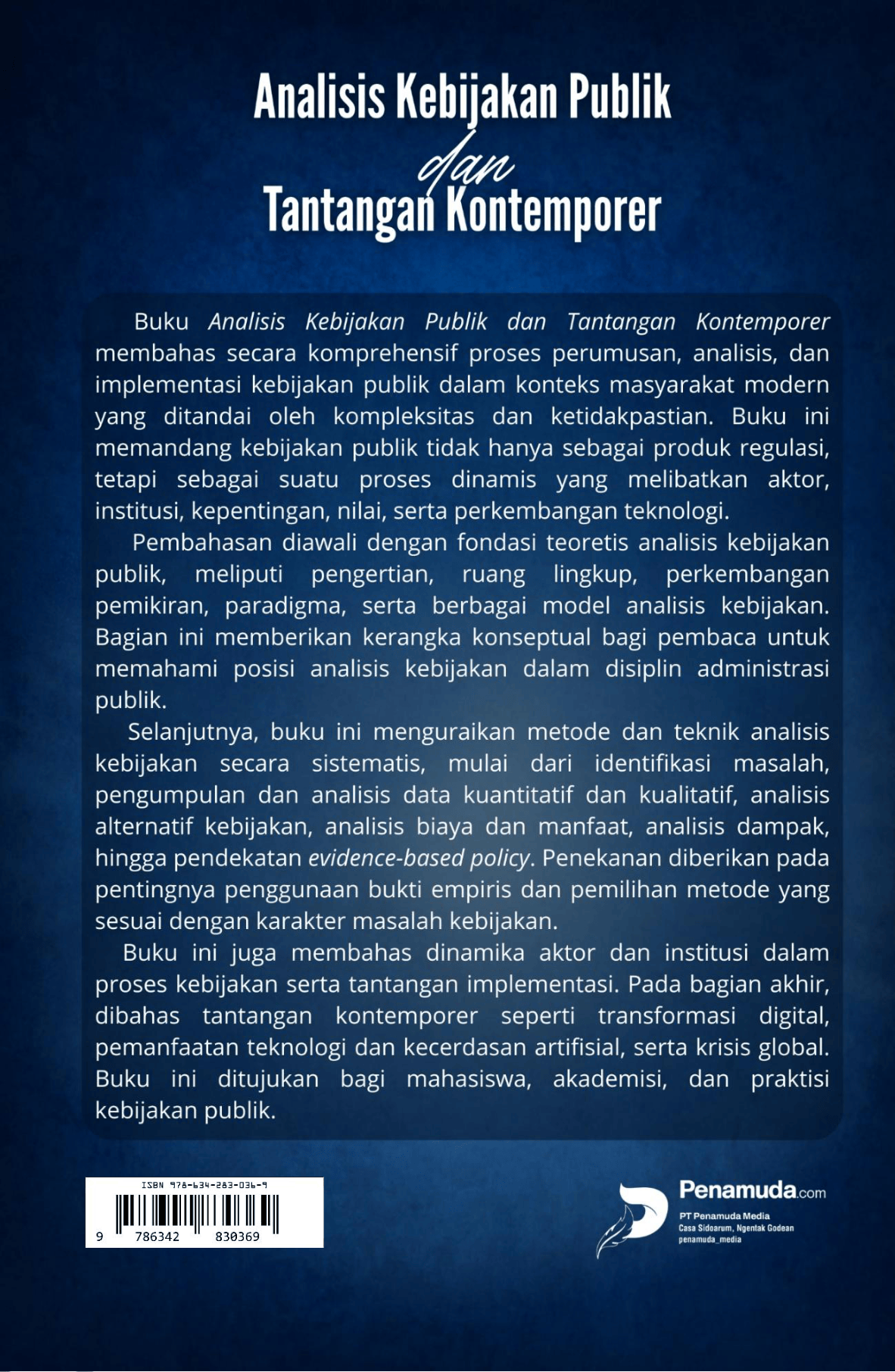 Buku Analisis Kebijakan Publik dan Tantangan Kontemporer membahas secara komprehensif proses perumusan, analisis, dan implementasi kebijakan publik dalam konteks masyarakat modern yang ditandai oleh kompleksitas dan ketidakpastian. Buku ini memandang kebijakan publik tidak hanya sebagai produk regulasi, tetapi sebagai suatu proses dinamis yang melibatkan aktor, institusi, kepentingan, nilai, serta perkembangan teknologi. Pembahasan diawali dengan fondasi teoretis analisis kebijakan publik, meliputi pengertian, ruang lingkup, perkembangan pemikiran, paradigma, serta berbagai model analisis kebijakan. Bagian ini memberikan kerangka konseptual bagi pembaca untuk memahami posisi analisis kebijakan dalam disiplin administrasi publik. Selanjutnya, buku ini menguraikan metode dan teknik analisis kebijakan secara sistematis, mulai dari identifikasi masalah, pengumpulan dan analisis data kuantitatif dan kualitatif, analisis alternatif kebijakan, analisis biaya dan manfaat, analisis dampak, hingga pendekatan evidence-based policy . Penekanan diberikan pada pentingnya penggunaan bukti empiris dan pemilihan metode yang sesuai dengan karakter masalah kebijakan. Buku ini juga membahas dinamika aktor dan institusi dalam proses kebijakan serta tantangan implementasi. Pada bagian akhir, dibahas tantangan kontemporer seperti transformasi digital, pemanfaatan teknologi dan kecerdasan artifisial, serta krisis global. Buku ini ditujukan bagi mahasiswa, akademisi, dan praktisi kebijakan publik.