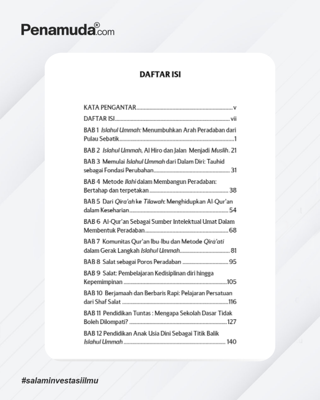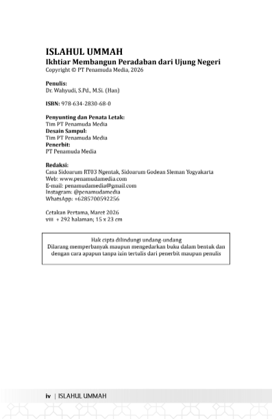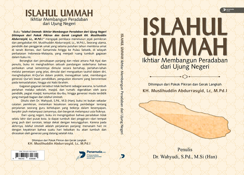 Buku “Islahul Ummah: Ikhtiar Membangun Peradaban dari Ujung Negeri” mengajak pembaca menelusuri jejak pemikiran dan pengabdian KH. Muslihuddin Abdurrasyid, Lc., M.Pd.I., Seorang ulama, pendidik dan penggerak umat yang selama puluhan tahun membina umat di tanah Borneo, dari Samarinda hingga ke Pulau Sebatik, di wilayah perbatasan Indonesia–Malaysia, yang menjadi ruang tumbuh gagasan dalam buku ini. Berangkat dari percakapan panjang dan relasi antara Pak Kyai dan penulis, buku ini menghadirkan sebuah pandangan sederhana: bahwa perbaikan umat semestinya dimulai secara bertahap, perlahan-lahan melalui pemetaan yang jelas, dimulai dari menguatkan tauhid dalam diri, menghidupkan Al-Qur’an dalam praktik, menegakkan salat, membangun generasi Qur’ani lewat pendidikan, penguatan ekonomi yang berorientasi pada kemaslahatan, hingga visi Nabi Ibrahim. Gagasan-gagasan tersebut tidak berhenti sebagai wacana. Ia tumbuh perlahan melalui sekolah, masjid, dan rumah; digerakkan oleh para pendidik, pegiat masjid, komunitas ibu-ibu, hingga generasi muda terdidik yang menjadi bagian dari Islahul Ummah . Ditulis oleh Dr. Wahyudi, S.Pd., M.Si (Han), buku ini bukan sekadar catatan pemikiran, melainkan kesaksian seorang pembelajar tentang perjalanan seorang guru kehidupan yang bekerja dalam kesenyapan, berpikir jauh melampaui zamannya, dan bergerak melampaui usia fisiknya. Dari ujung negeri, buku ini mengingatkan bahwa peradaban tidak selalu lahir dari pusat kota. Ia dapat tumbuh dari pinggiran—dari tempat yang jauh dari sorotan, tetapi dekat dengan kesungguhan. Karena pada akhirnya, Islahul Ummah adalah perjalanan panjang: menanam hari ini dengan keyakinan bahwa suatu hari kebaikan itu akan tumbuh dan dirasakan oleh generasi yang datang setelah kita.