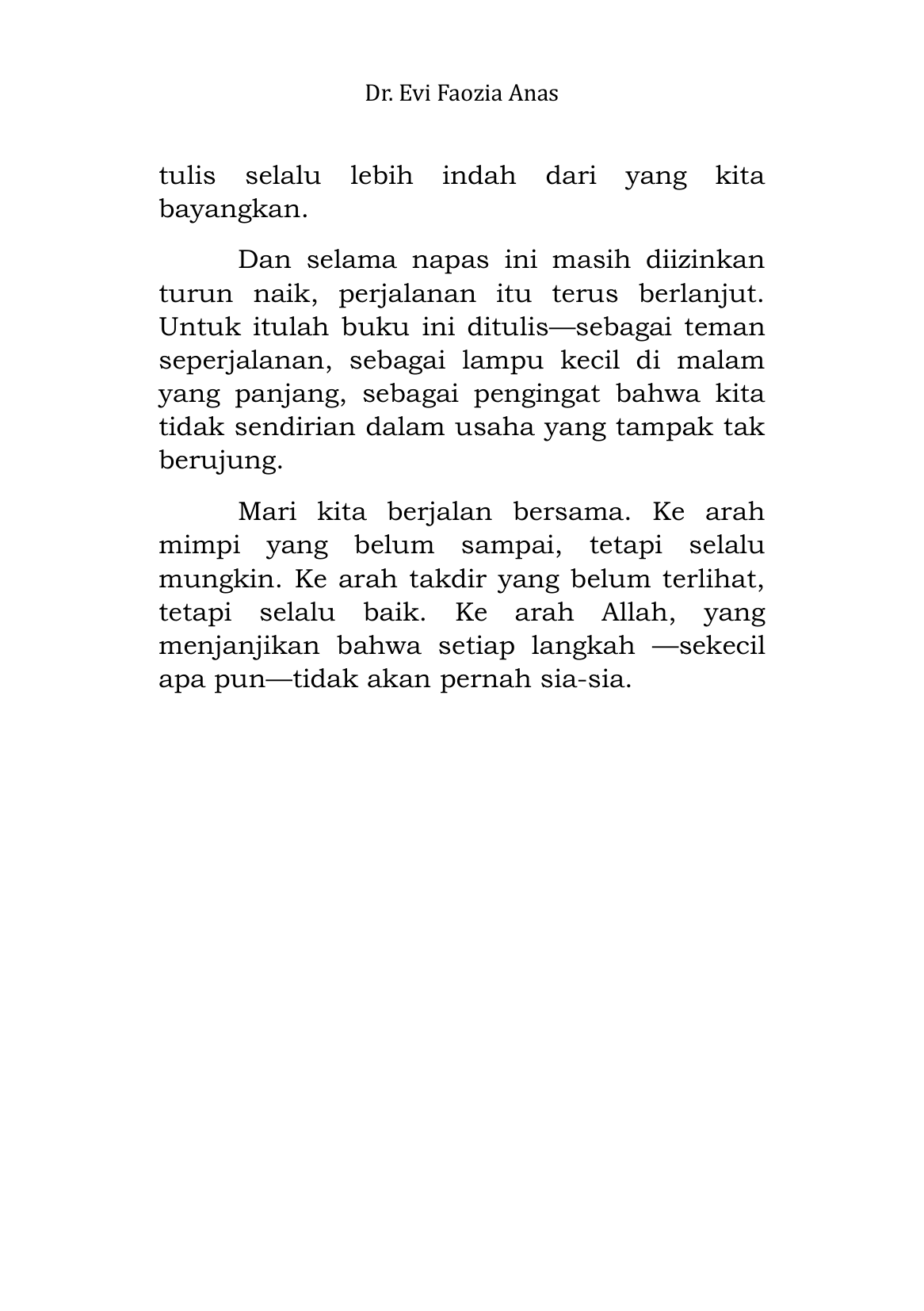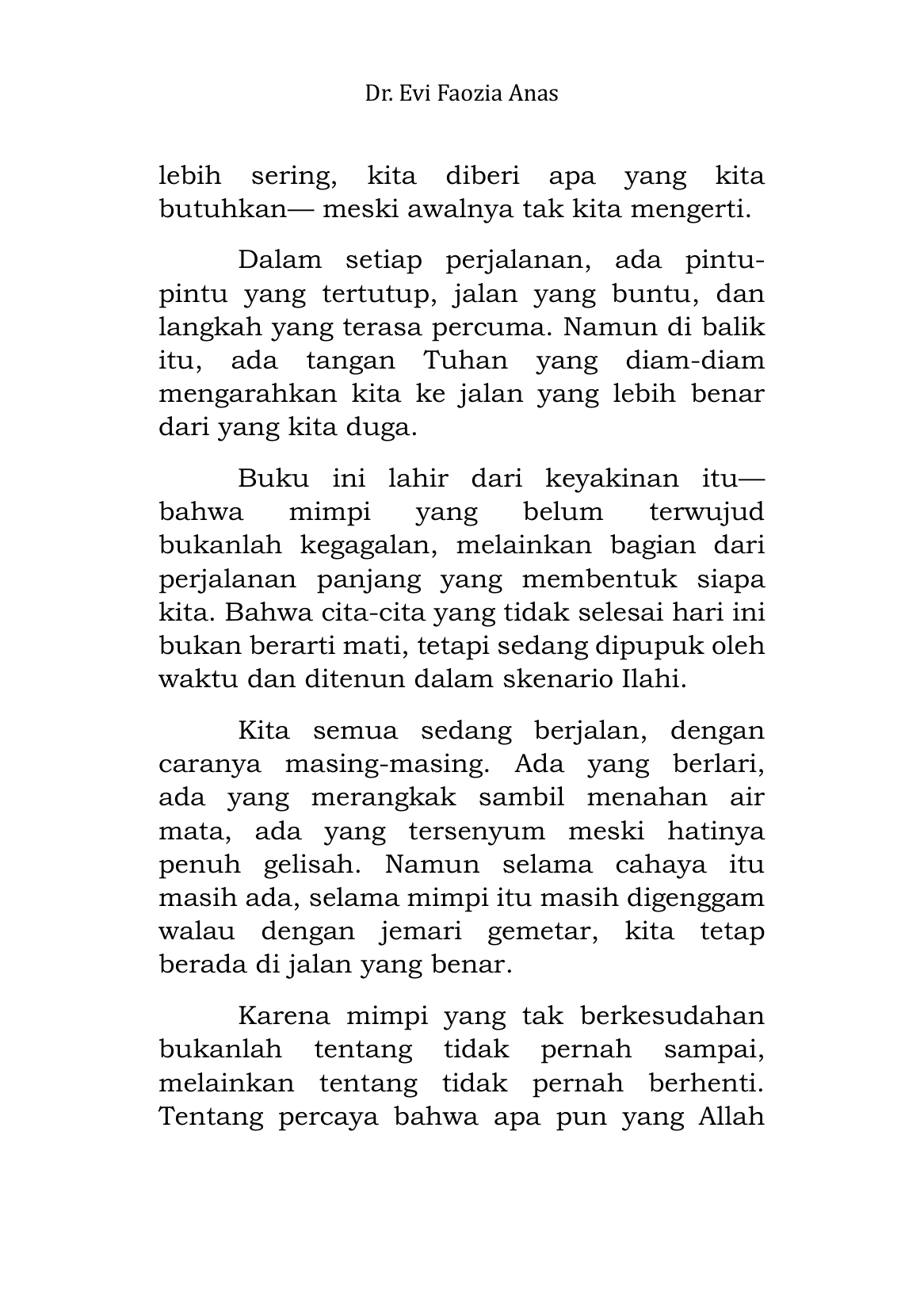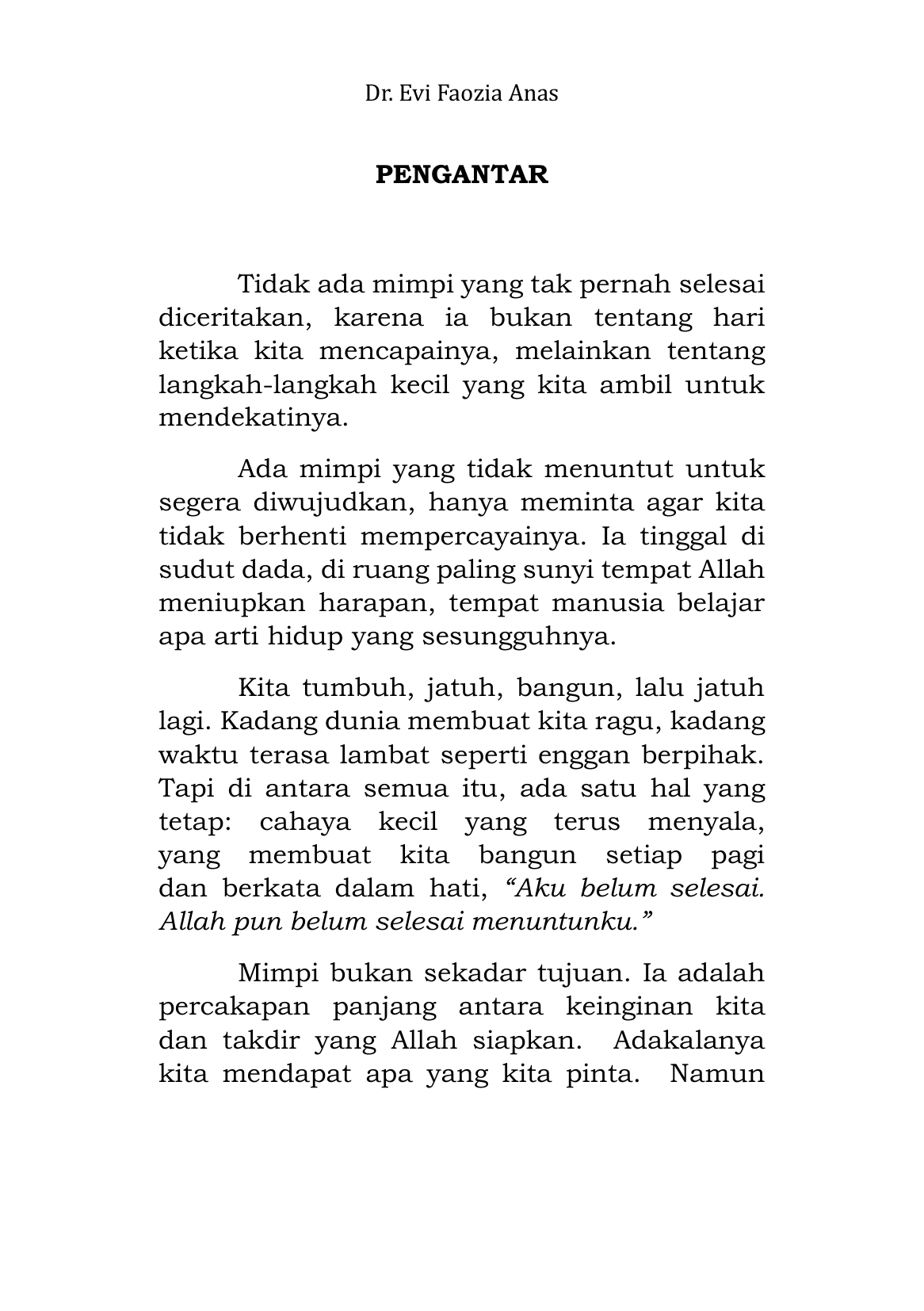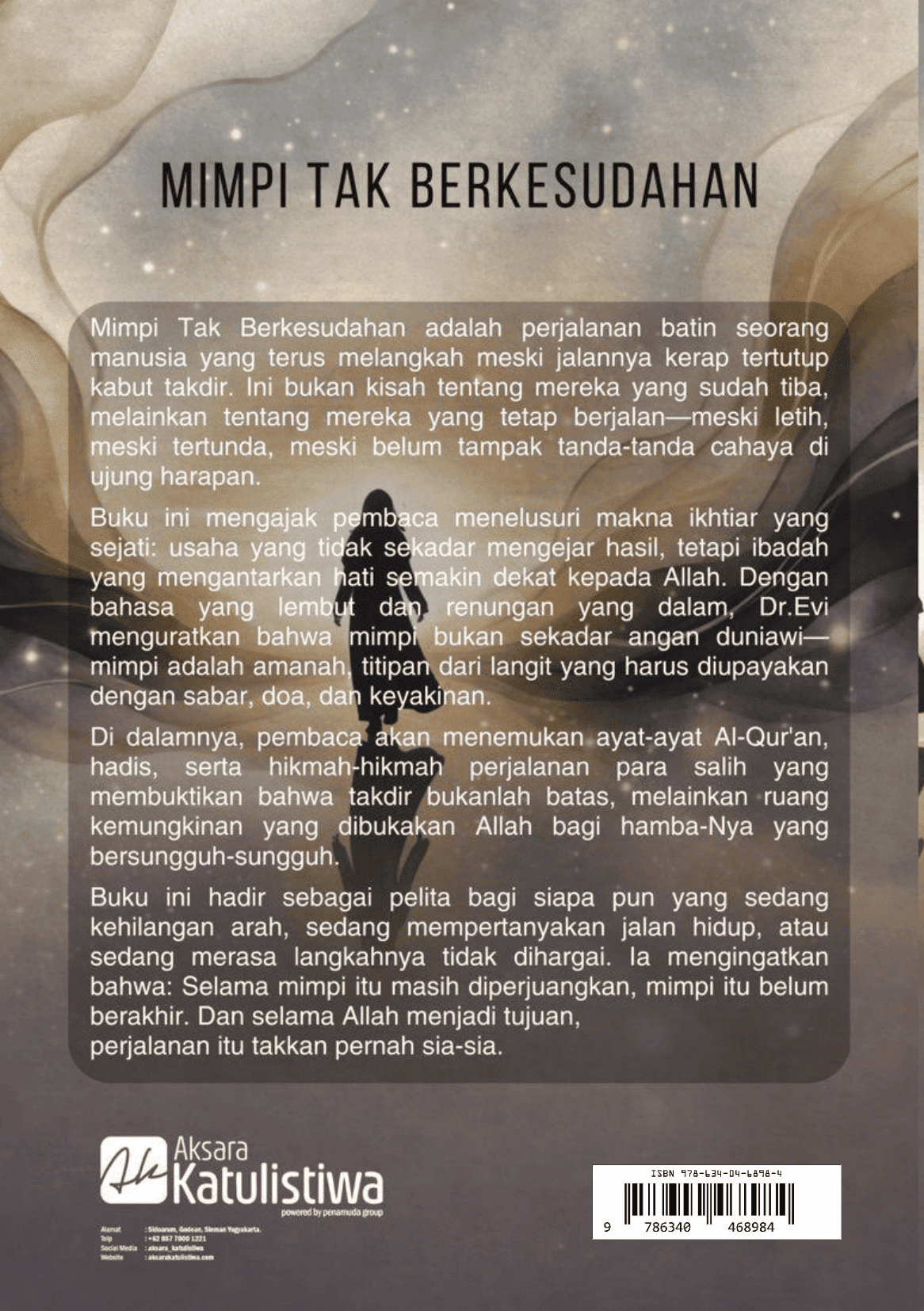 Buku ini mengajak pembaca menelusuri makna ikhtiar yang sejati: usaha yang tidak sekadar mengejar hasil, tetapi ibadah yang mengantarkan hati semakin dekat kepada Allah. Dengan bahasa yang lembut dan renungan yang dalam, Dr.Evi menguratkan bahwa mimpi bukan sekadar angan duniawi-mimpi adalah amanah, titipan dari langit yang harus diupayakan dengan sabar, doa, dan keyakinan.