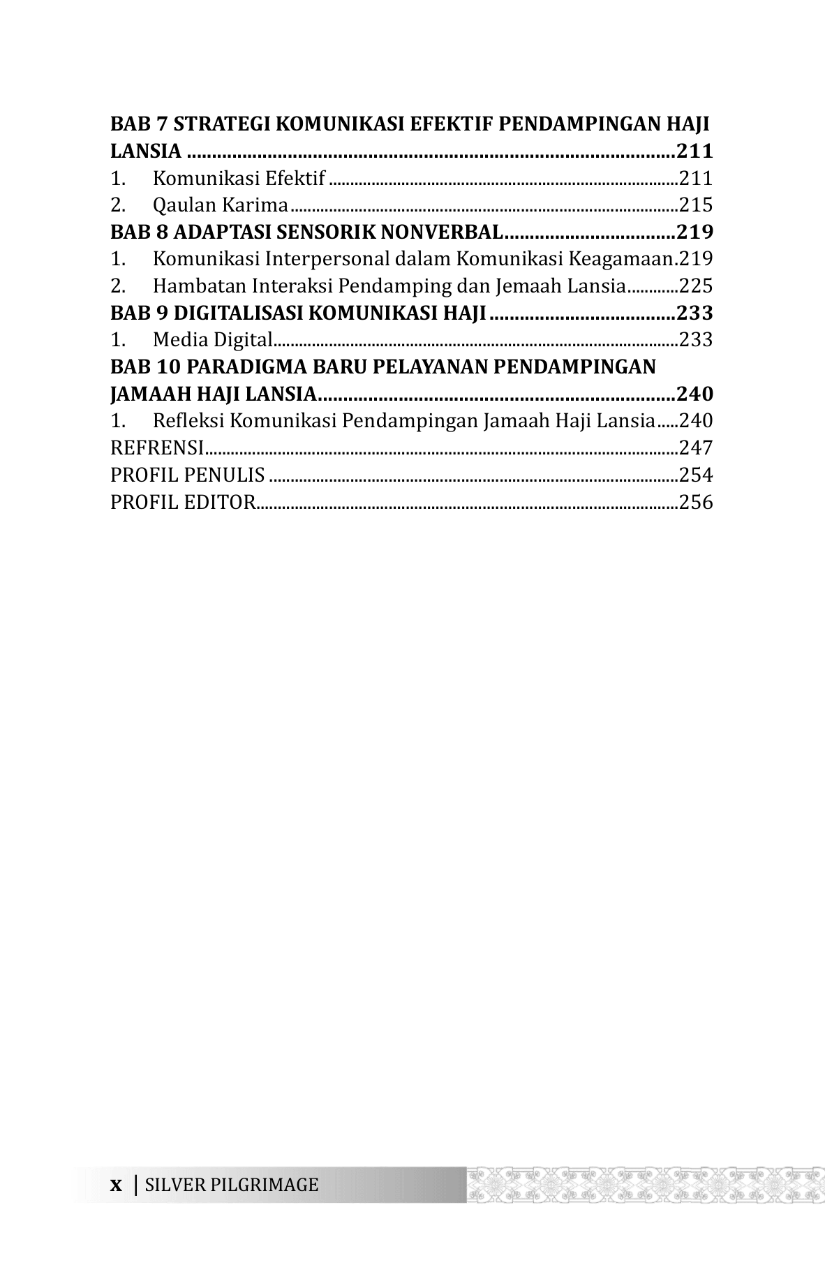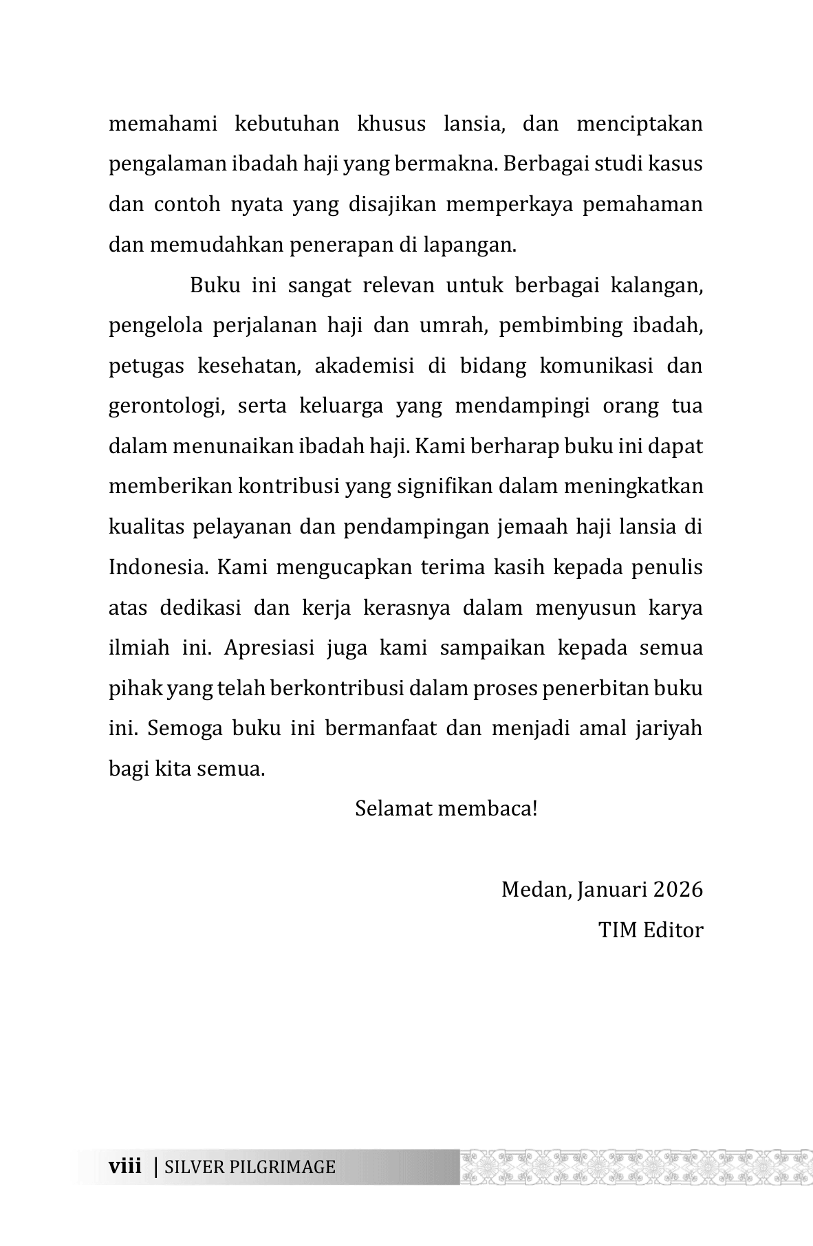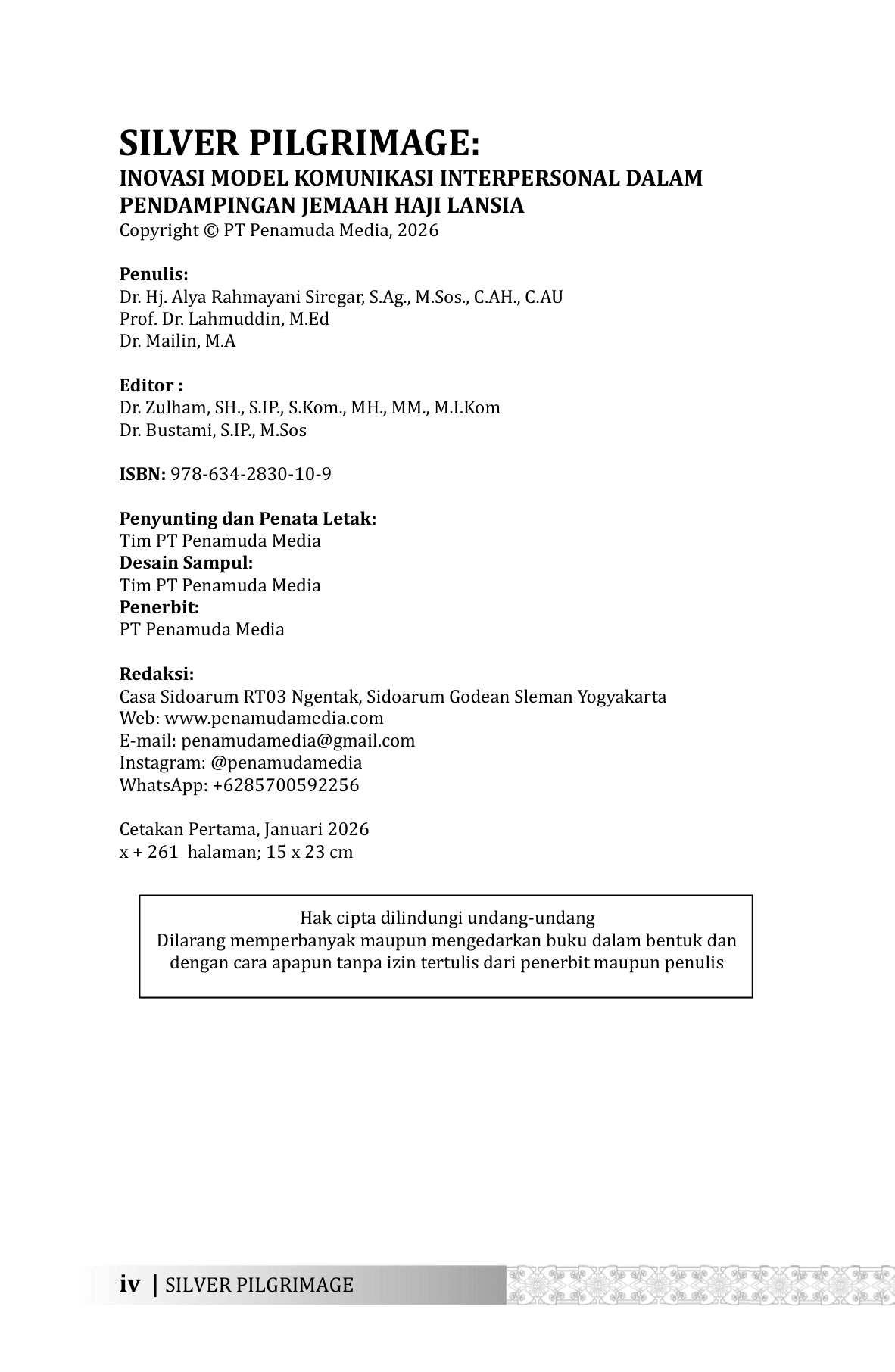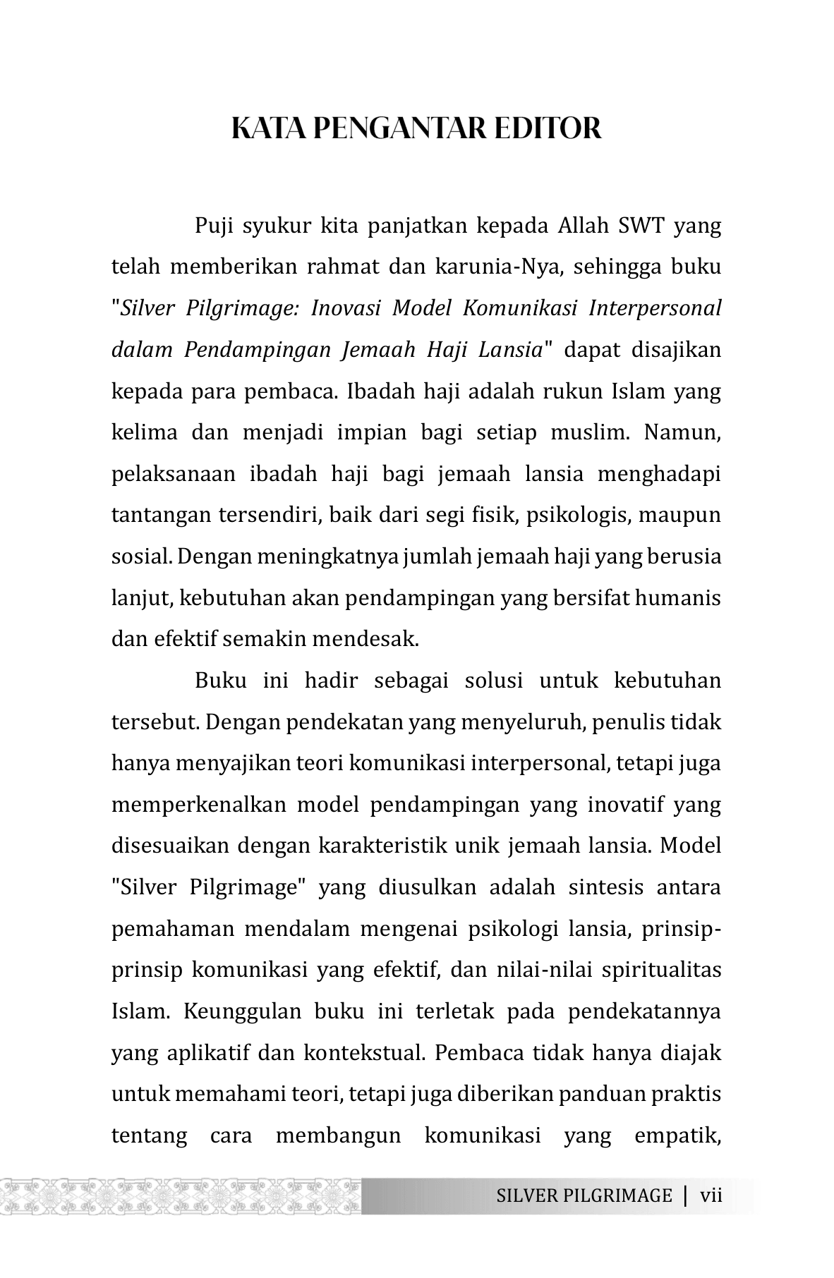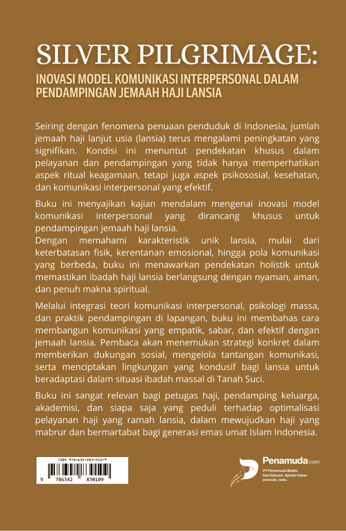 Seiring dengan fenomena penuaan penduduk di Indonesia, jumlah jemaah haji lanjut usia (lansia) terus mengalami peningkatan yang signifikan. Kondisi ini menuntut pendekatan khusus dalam pelayanan dan pendampingan yang tidak hanya memperhatikan aspek ritual keagamaan, tetapi juga aspek psikososial, kesehatan, dan komunikasi interpersonal yang efektif. Buku ini menyajikan kajian mendalam mengenai inovasi model komunikasi interpersonal yang dirancang khusus untuk pendampingan jemaah haji lansia. Dengan memahami karakteristik unik lansia, mulai dari keterbatasan fisik, kerentanan emosional, hingga pola komunikasi yang berbeda, buku ini menawarkan pendekatan holistik untuk memastikan ibadah haji lansia berlangsung dengan nyaman, aman, dan penuh makna spiritual. Melalui integrasi teori komunikasi interpersonal, psikologi massa, dan praktik pendampingan di lapangan, buku ini membahas cara membangun komunikasi yang empatik, sabar, dan efektif dengan jemaah lansia. Pembaca akan menemukan strategi konkret dalam memberikan dukungan sosial, mengelola tantangan komunikasi, serta menciptakan lingkungan yang kondusif bagi lansia untuk beradaptasi dalam situasi ibadah massal di Tanah Suci. Buku ini sangat relevan bagi petugas haji, pendamping keluarga, akademisi, dan siapa saja yang peduli terhadap optimalisasi pelayanan haji yang ramah lansia, dalam mewujudkan haji yang mabrur dan bermartabat bagi generasi emas umat Islam Indonesia.