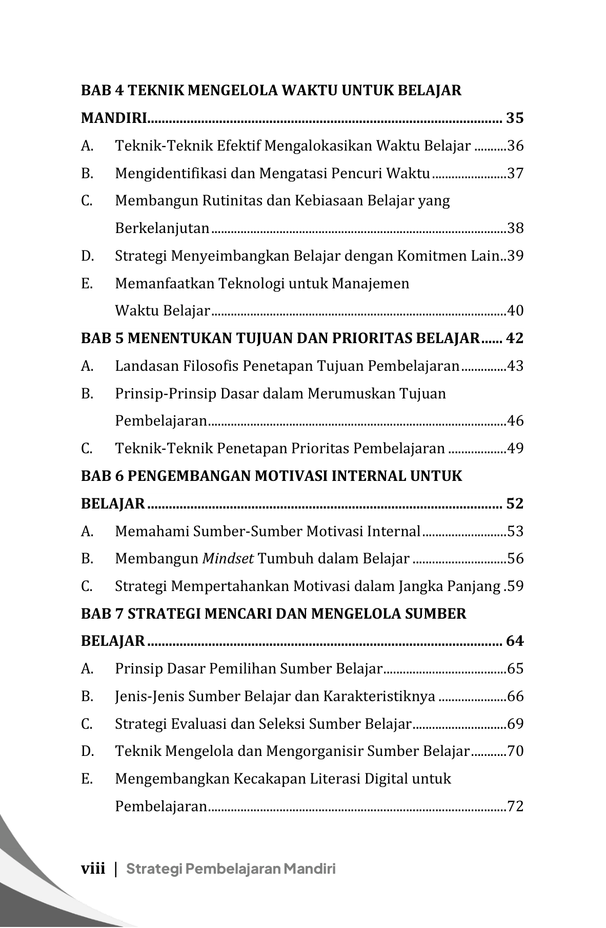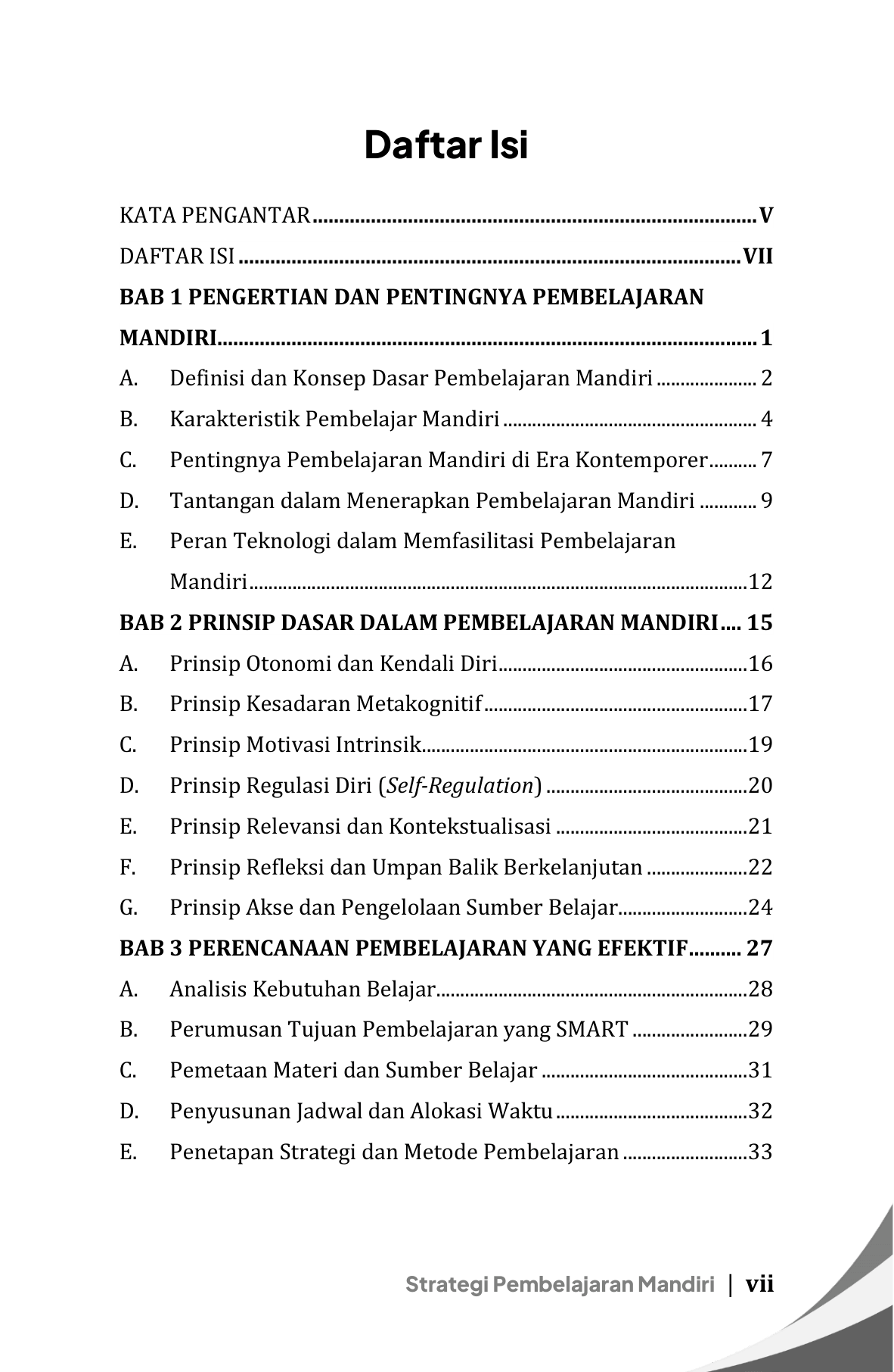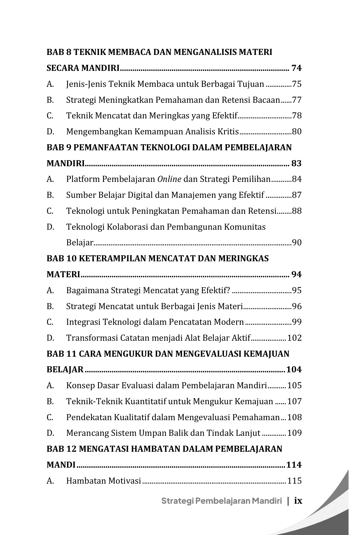 Buku ini mengupas berbagai pendekatan, teknik, dan kebiasaan efektif yang membantu pembelajar mengembangkan kemandirian dalam proses belajarnya. Disajikan dengan bahasa yang ringkas dan aplikatif, buku ini memandu pembaca untuk memahami cara menetapkan tujuan belajar, mengelola waktu, membangun motivasi intrinsik, memanfaatkan teknologi pendidikan, serta melakukan refleksi dan evaluasi diri secara berkelanjutan. Melalui contoh praktis dan strategi yang mudah diterapkan, buku ini dirancang untuk mendukung pelajar, mahasiswa, maupun profesional agar mampu mengatur proses belajar sesuai kebutuhan dan ritme masing-masing, sehingga hasil pembelajaran menjadi lebih optimal, berkelanjutan, dan relevan dengan tantangan dunia modern.
