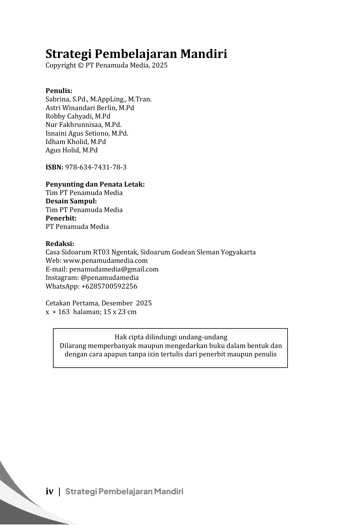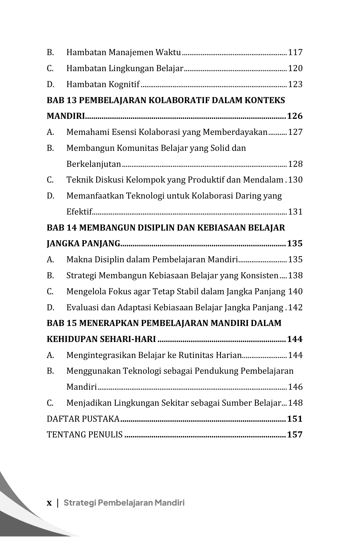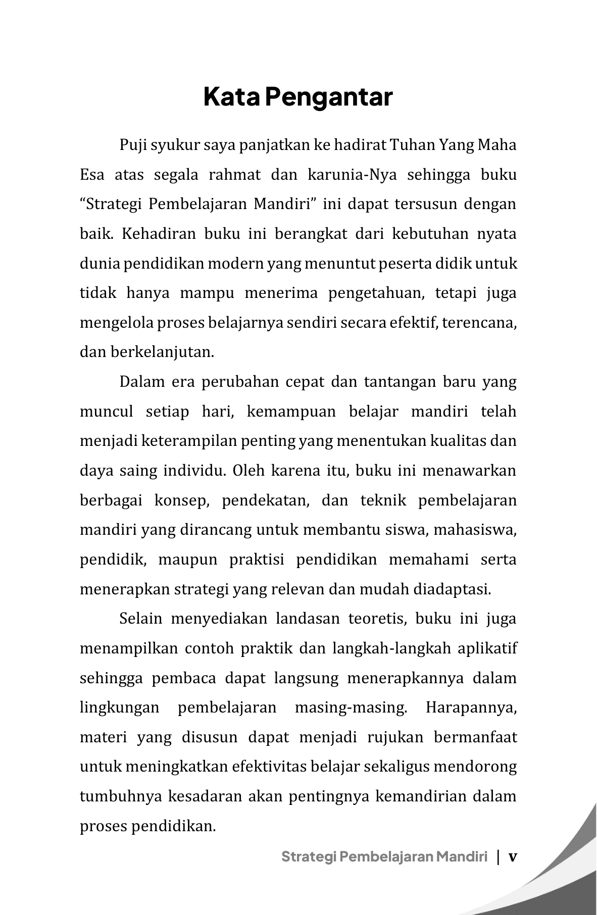 Buku ini mengupas berbagai pendekatan, teknik, dan kebiasaan efektif yang membantu pembelajar mengembangkan kemandirian dalam proses belajarnya. Disajikan dengan bahasa yang ringkas dan aplikatif, buku ini memandu pembaca untuk memahami cara menetapkan tujuan belajar, mengelola waktu, membangun motivasi intrinsik, memanfaatkan teknologi pendidikan, serta melakukan refleksi dan evaluasi diri secara berkelanjutan. Melalui contoh praktis dan strategi yang mudah diterapkan, buku ini dirancang untuk mendukung pelajar, mahasiswa, maupun profesional agar mampu mengatur proses belajar sesuai kebutuhan dan ritme masing-masing, sehingga hasil pembelajaran menjadi lebih optimal, berkelanjutan, dan relevan dengan tantangan dunia modern.