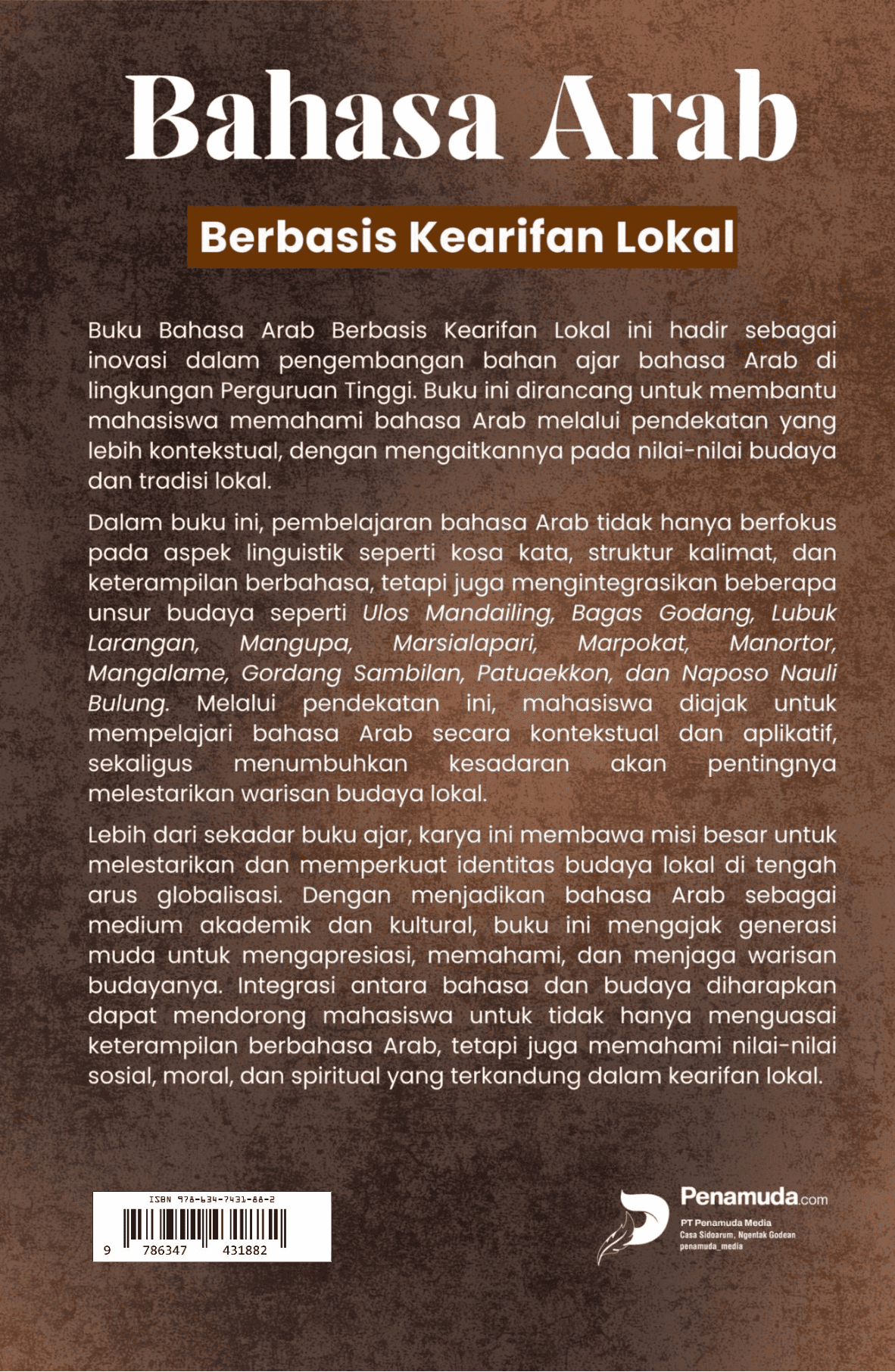 Buku Bahasa Arab Berbasis Kearifan Lokal ini hadir sebagai inovasi dalam pengembangan bahan ajar bahasa Arab di lingkungan Perguruan Tinggi. Buku ini dirancang untuk membantu mahasiswa memahami bahasa Arab melalui pendekatan yang lebih kontekstual, dengan mengaitkannya pada nilai-nilai budaya dan tradisi lokal. Dalam buku ini, pembelajaran bahasa Arab tidak hanya berfokus pada aspek linguistik seperti kosa kata, struktur kalimat, dan keterampilan berbahasa, tetapi juga mengintegrasikan beberapa unsur budaya seperti Ulos Mandailing, Bagas Godang, Lubuk Larangan, Mangupa, Marsialapari, Marpokat, Manortor, Mangalame, Gordang Sambilan, Patuaekkon, dan Naposo Nauli Bulung. Melalui pendekatan ini, mahasiswa diajak untuk mempelajari bahasa Arab secara kontekstual dan aplikatif, sekaligus menumbuhkan kesadaran akan pentingnya melestarikan warisan budaya lokal. Lebih dari sekadar buku ajar, karya ini membawa misi besar untuk melestarikan dan memperkuat identitas budaya lokal di tengah arus globalisasi. Dengan menjadikan bahasa Arab sebagai medium akademik dan kultural, buku ini mengajak generasi muda untuk mengapresiasi, memahami, dan menjaga warisan budayanya. Integrasi antara bahasa dan budaya diharapkan dapat mendorong mahasiswa untuk tidak hanya menguasai keterampilan berbahasa Arab, tetapi juga memahami nilai-nilai sosial, moral, dan spiritual yang terkandung dalam kearifan lokal.
