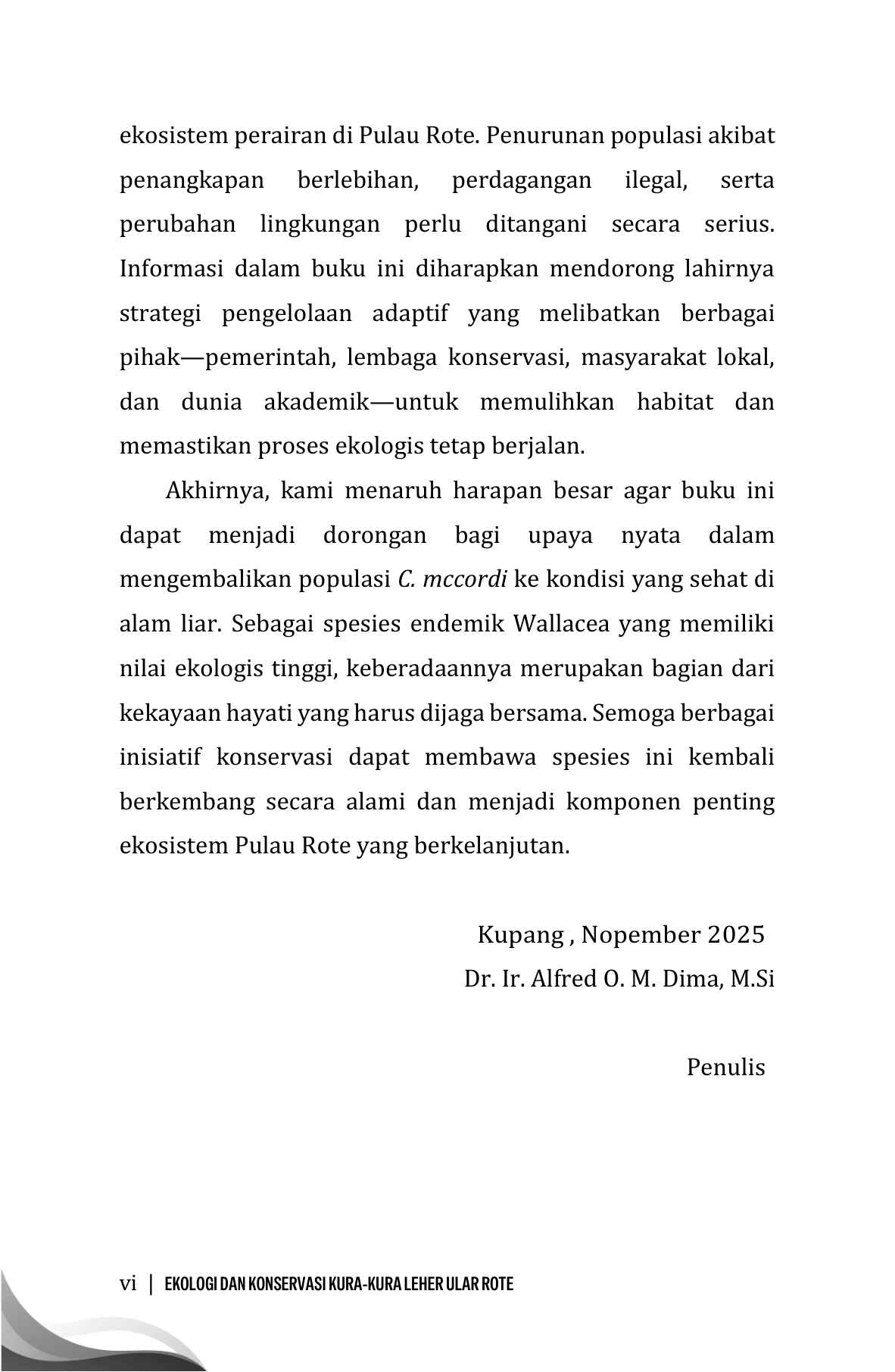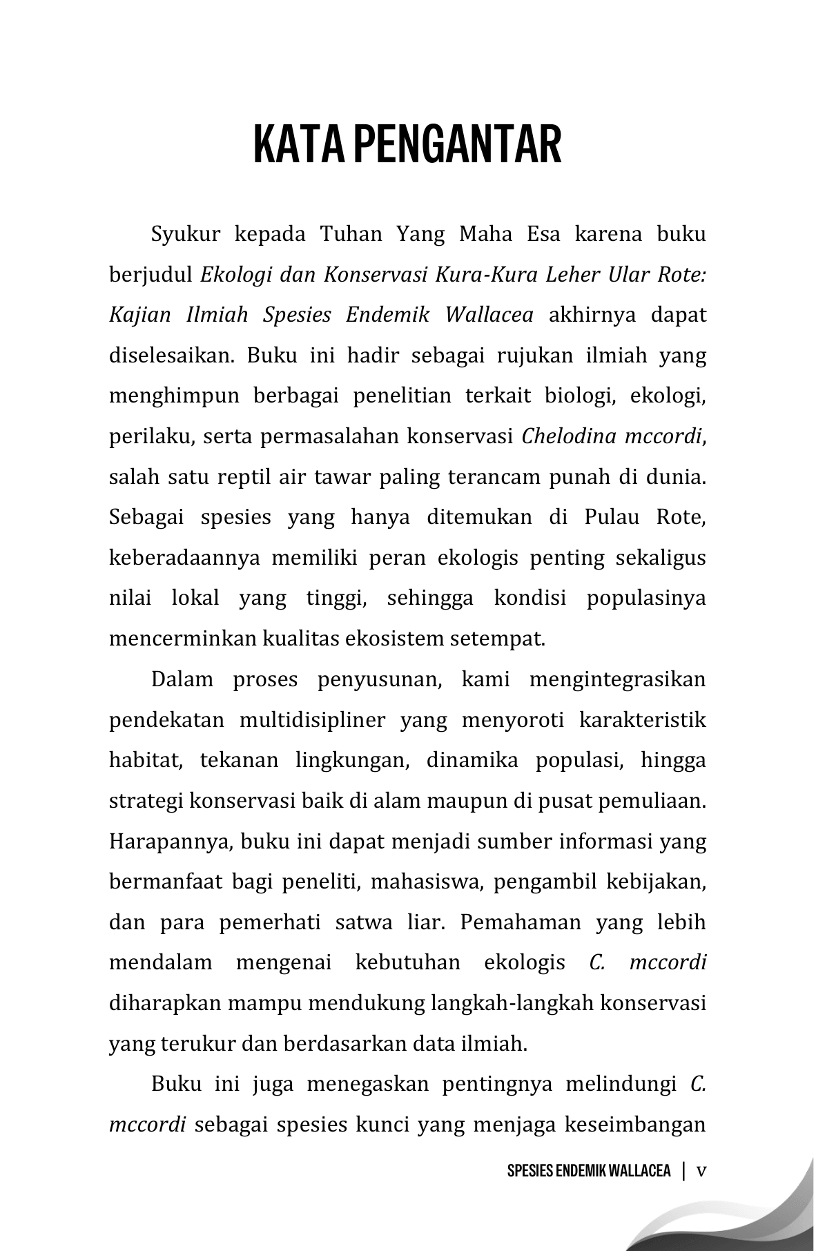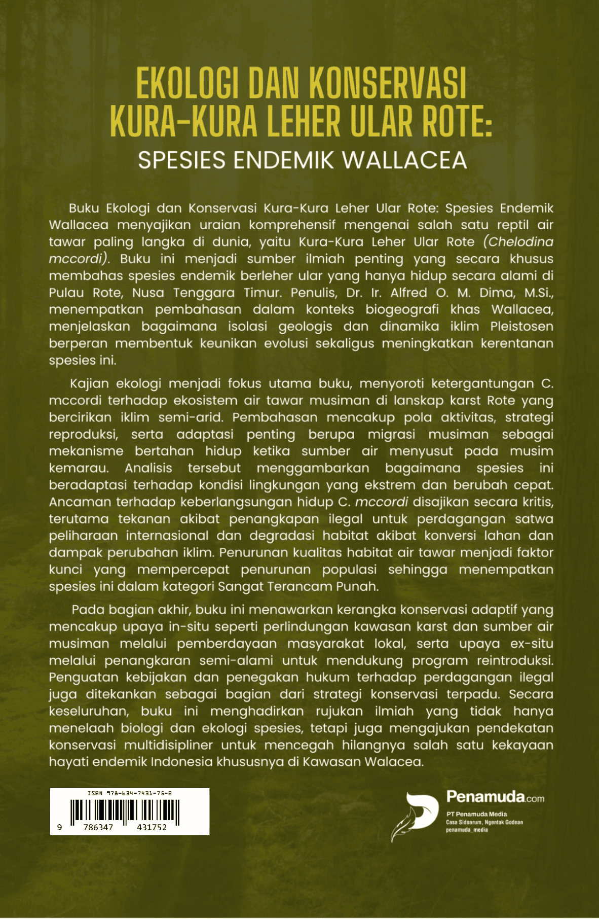 Buku Ekologi dan Konservasi Kura-Kura Leher Ular Rote: Spesies Endemik Wallacea menyajikan uraian komprehensif mengenai salah satu reptil air tawar paling langka di dunia, yaitu Kura-Kura Leher Ular Rote (Chelodina mccordi). Buku ini menjadi sumber ilmiah penting yang secara khusus membahas spesies endemik berleher ular yang hanya hidup secara alami di Pulau Rote, Nusa Tenggara Timur. Penulis, Dr. Ir. Alfred O. M. Dima, M.Si., menempatkan pembahasan dalam konteks biogeografi khas Wallacea, menjelaskan bagaimana isolasi geologis dan dinamika iklim Pleistosen berperan membentuk keunikan evolusi sekaligus meningkatkan kerentanan spesies ini. Kajian ekologi menjadi fokus utama buku, menyoroti ketergantungan C. mccordi terhadap ekosistem air tawar musiman di lanskap karst Rote yang bercirikan iklim semi-arid. Pembahasan mencakup pola aktivitas, strategi reproduksi, serta adaptasi penting berupa migrasi musiman sebagai mekanisme bertahan hidup ketika sumber air menyusut pada musim kemarau. Analisis tersebut menggambarkan bagaimana spesies ini beradaptasi terhadap kondisi lingkungan yang ekstrem dan berubah cepat. Ancaman terhadap keberlangsungan hidup C. mccordi disajikan secara kritis, terutama tekanan akibat penangkapan ilegal untuk perdagangan satwa peliharaan internasional dan degradasi habitat akibat konversi lahan dan dampak perubahan iklim. Penurunan kualitas habitat air tawar menjadi faktor kunci yang mempercepat penurunan populasi sehingga menempatkan spesies ini dalam kategori Sangat Terancam Punah. Pada bagian akhir, buku ini menawarkan kerangka konservasi adaptif yang mencakup upaya in-situ seperti perlindungan kawasan karst dan sumber air musiman melalui pemberdayaan masyarakat lokal, serta upaya ex-situ melalui penangkaran semi-alami untuk mendukung program reintroduksi. Penguatan kebijakan dan penegakan hukum terhadap perdagangan ilegal juga ditekankan sebagai bagian dari strategi konservasi terpadu. Secara keseluruhan, buku ini menghadirkan rujukan ilmiah yang tidak hanya menelaah biologi dan ekologi spesies, tetapi juga mengajukan pendekatan konservasi multidisipliner untuk mencegah hilangnya salah satu kekayaan hayati endemik Indonesia khususnya di Kawasan Walacea.