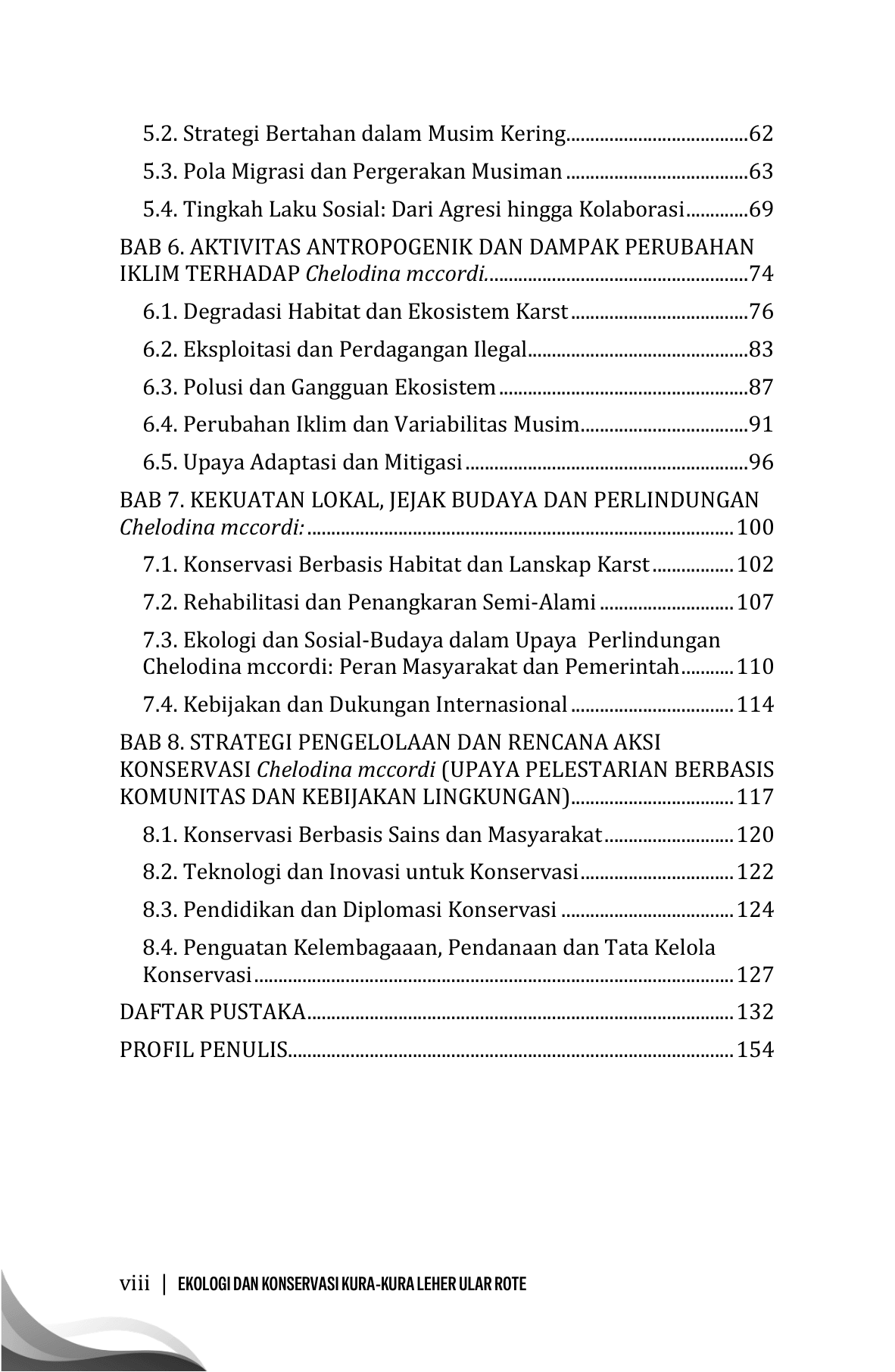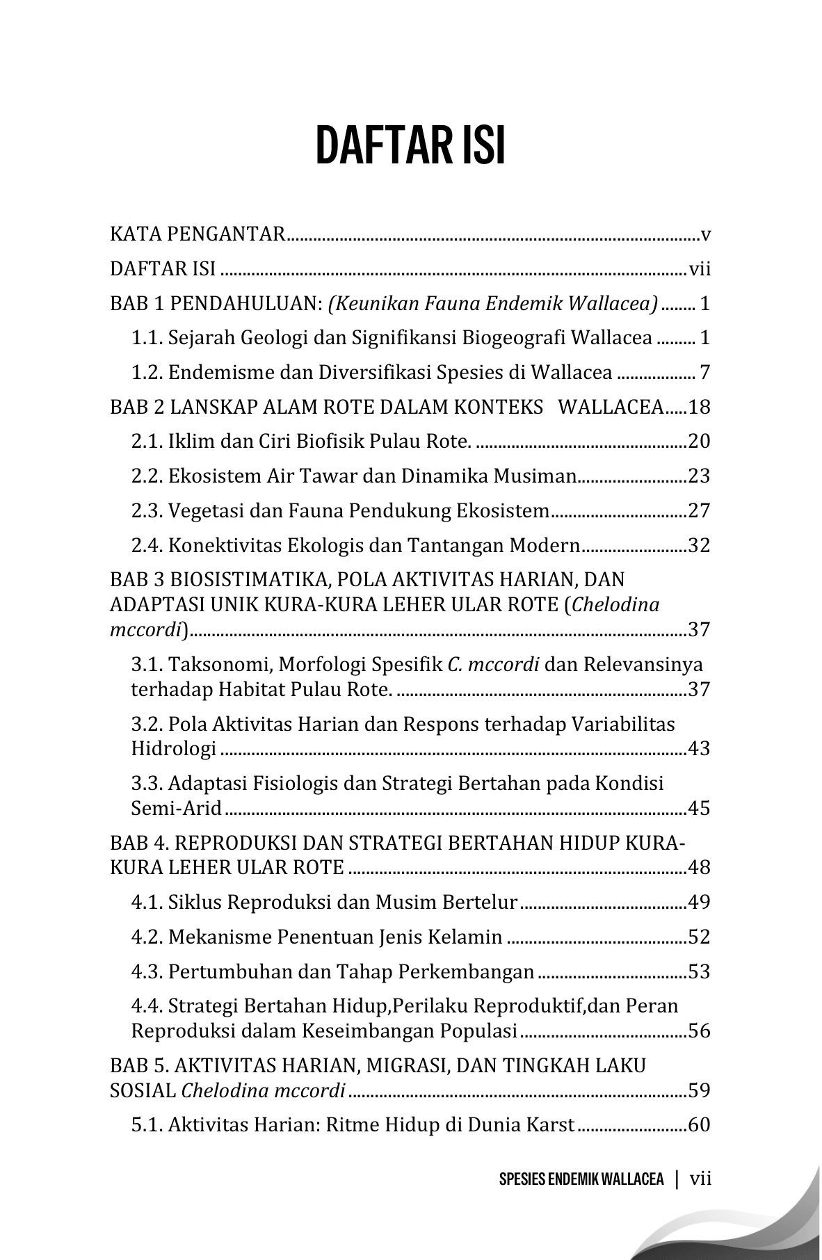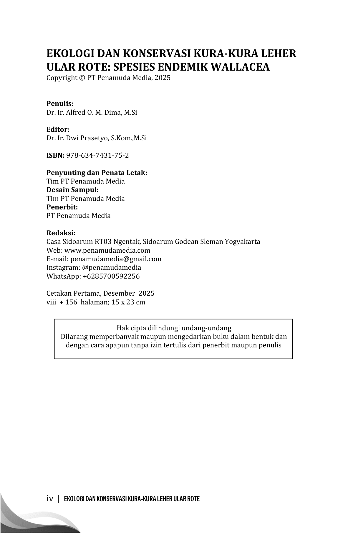 Buku Ekologi dan Konservasi Kura-Kura Leher Ular Rote: Spesies Endemik Wallacea menyajikan uraian komprehensif mengenai salah satu reptil air tawar paling langka di dunia, yaitu Kura-Kura Leher Ular Rote (Chelodina mccordi). Buku ini menjadi sumber ilmiah penting yang secara khusus membahas spesies endemik berleher ular yang hanya hidup secara alami di Pulau Rote, Nusa Tenggara Timur. Penulis, Dr. Ir. Alfred O. M. Dima, M.Si., menempatkan pembahasan dalam konteks biogeografi khas Wallacea, menjelaskan bagaimana isolasi geologis dan dinamika iklim Pleistosen berperan membentuk keunikan evolusi sekaligus meningkatkan kerentanan spesies ini. Kajian ekologi menjadi fokus utama buku, menyoroti ketergantungan C. mccordi terhadap ekosistem air tawar musiman di lanskap karst Rote yang bercirikan iklim semi-arid. Pembahasan mencakup pola aktivitas, strategi reproduksi, serta adaptasi penting berupa migrasi musiman sebagai mekanisme bertahan hidup ketika sumber air menyusut pada musim kemarau. Analisis tersebut menggambarkan bagaimana spesies ini beradaptasi terhadap kondisi lingkungan yang ekstrem dan berubah cepat. Ancaman terhadap keberlangsungan hidup C. mccordi disajikan secara kritis, terutama tekanan akibat penangkapan ilegal untuk perdagangan satwa peliharaan internasional dan degradasi habitat akibat konversi lahan dan dampak perubahan iklim. Penurunan kualitas habitat air tawar menjadi faktor kunci yang mempercepat penurunan populasi sehingga menempatkan spesies ini dalam kategori Sangat Terancam Punah. Pada bagian akhir, buku ini menawarkan kerangka konservasi adaptif yang mencakup upaya in-situ seperti perlindungan kawasan karst dan sumber air musiman melalui pemberdayaan masyarakat lokal, serta upaya ex-situ melalui penangkaran semi-alami untuk mendukung program reintroduksi. Penguatan kebijakan dan penegakan hukum terhadap perdagangan ilegal juga ditekankan sebagai bagian dari strategi konservasi terpadu. Secara keseluruhan, buku ini menghadirkan rujukan ilmiah yang tidak hanya menelaah biologi dan ekologi spesies, tetapi juga mengajukan pendekatan konservasi multidisipliner untuk mencegah hilangnya salah satu kekayaan hayati endemik Indonesia khususnya di Kawasan Walacea.