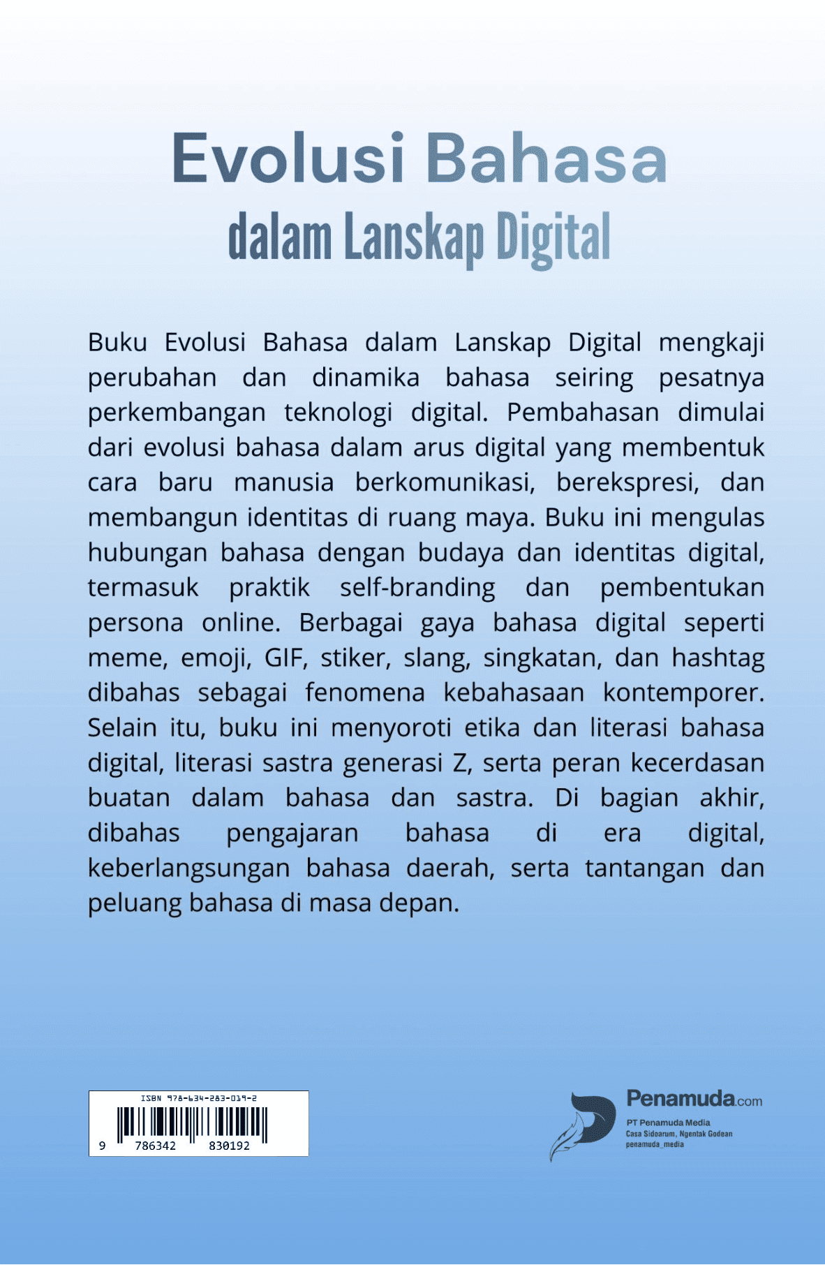 Buku Evolusi Bahasa dalam Lanskap Digital mengkaji perubahan dan dinamika bahasa seiring pesatnya perkembangan teknologi digital. Pembahasan dimulai dari evolusi bahasa dalam arus digital yang membentuk cara baru manusia berkomunikasi, berekspresi, dan membangun identitas di ruang maya. Buku ini mengulas hubungan bahasa dengan budaya dan identitas digital, termasuk praktik self-branding dan pembentukan persona online. Berbagai gaya bahasa digital seperti meme, emoji, GIF, stiker, slang, singkatan, dan hashtag dibahas sebagai fenomena kebahasaan kontemporer. Selain itu, buku ini menyoroti etika dan literasi bahasa digital, literasi sastra generasi Z, serta peran kecerdasan buatan dalam bahasa dan sastra. Di bagian akhir, dibahas pengajaran bahasa di era digital, keberlangsungan bahasa daerah, serta tantangan dan peluang bahasa di masa depan.