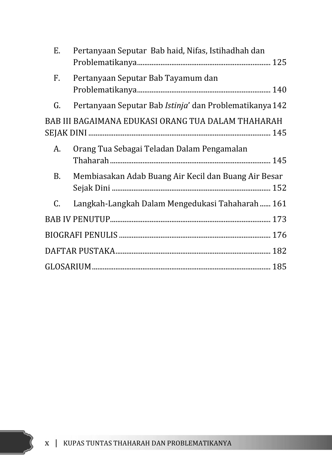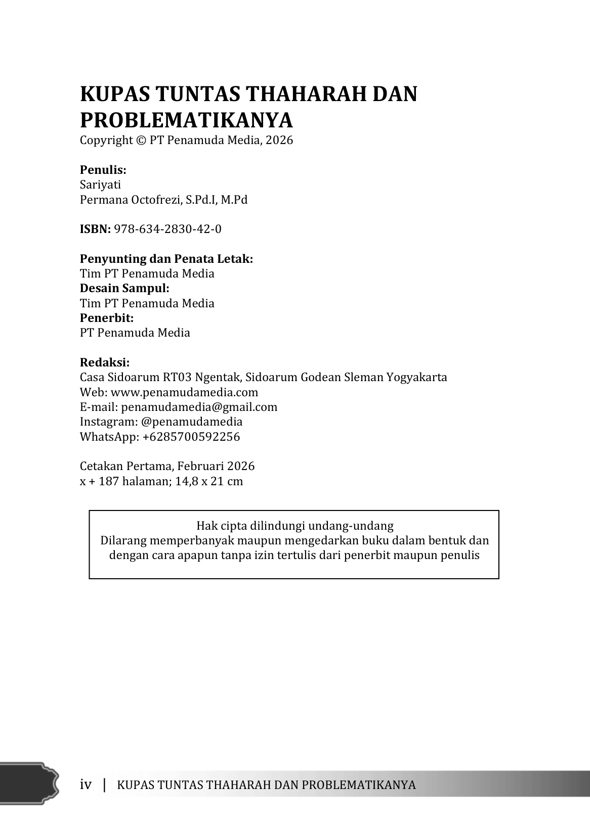 Thaharah dalam rangka menjaga kesucian dan kebersihan dibutuhkan seorang muslim dalam menjalankan ibadah kepada Allah swt. “Sesungguhnya Allah suka kepada orang-orang yang bertaubat dan suka kepada orang-orang yang membersihkan diri.” (QS. Al-Baqarah (2): 222). Menjaga kesucian mencakup 2 aspek yaitu kesucian lahir dan batin. Kesucian lahir berupa membersihkan kotoran yang ada bentuknya misalnya air kencing, kotoran manusia, madzi, wadi dan kotoran lainnya. Kesucian batin merupakan upaya membersihkan kotoran yang tidak berwujud nyata akan tetapi bisa merusak iman seseorang misalnya perilaku hasad, dengki, sombong, syirik, dan perbuatan lainnya yang mengotori hati manusia. Kehidupan manusia sehari-hari tidak terlepas dari problematika Thaharah yang sebaiknya tidak dibiarkan sehingga pentingnya pembahasan sebagai upaya mendapatkan solusinya. Air apa yang bisa digunakan untuk bersuci? Berapa hari termasuk hitungan hari haid? Bagaimana membersihkan air kencing? Bolehkan mandi junub bersama suami istri? Bagaimana tata cara mandi besar atau mandi wajib yang benar? Masih banyak lagi problematika yang akan dihadapi seorang muslim saat mau menjaga kesucian dan kebersihan. Simak pembahasannya dalam buku Kupas Tuntas Thaharah Dan Problematikanya. Membantu pembaca dalam menambah wawasan tentang Thaharah, serta pernak pernik problem yang dihadapi, tidak hanya itu buku ini juga menginformasikan kepada pembaca khususnya yang berperan sebagai orang tua, Bagaimana cara mengedukasi tata cara Thaharah kepada anak-anak sejak usia dini.