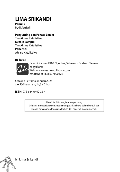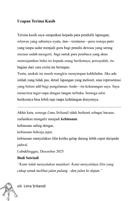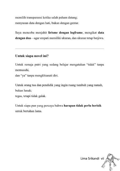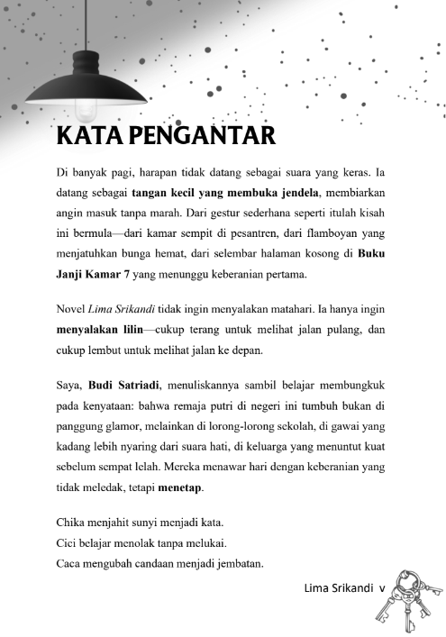 Lima Srikandi adalah novel tentang lima perempuan muda yang datang dari dunia dan cerita hidup yang berbeda. Masing-masing membawa mimpi, luka, dan kegelisahan yang tak selalu mampu mereka ucapkan dengan kata-kata.