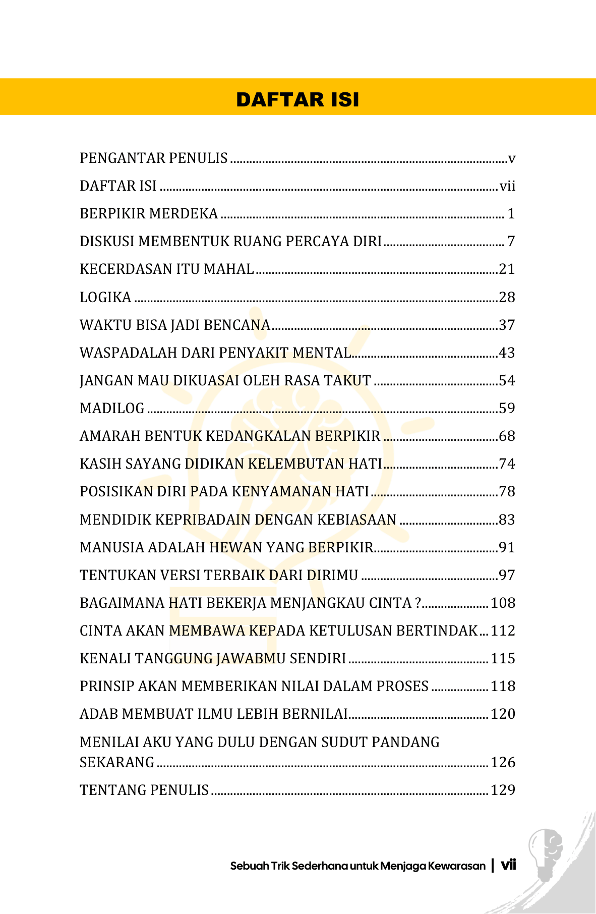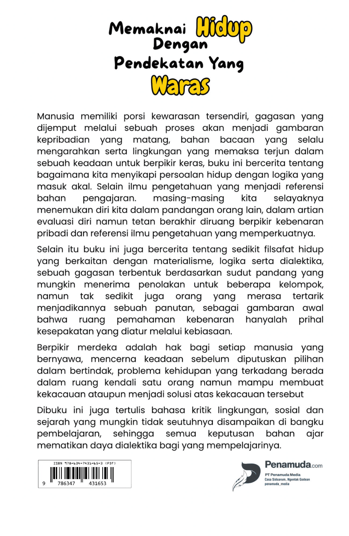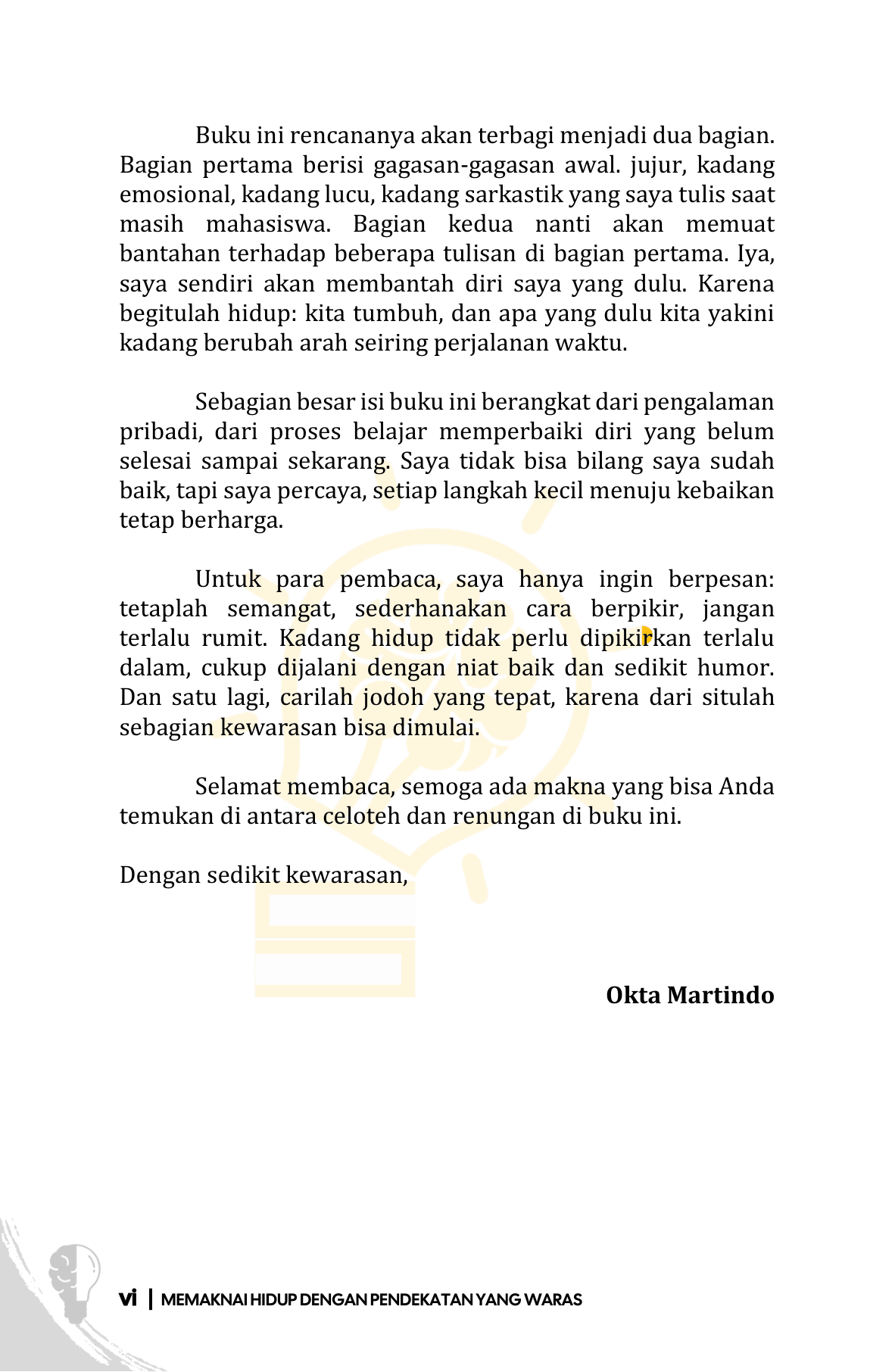 Manusia memiliki porsi kewarasan tersendiri, gagasan yang dijemput melalui sebuah proses akan menjadi gambaran kepribadian yang matang, bahan bacaan yang selalu mengarahkan serta lingkungan yang memaksa terjun dalam sebuah keadaan untuk berpikir keras, buku ini bercerita tentang bagaimana kita menyikapi persoalan hidup dengan logika yang masuk akal. Selain ilmu pengetahuan yang menjadi referensi bahan pengajaran. masing-masing kita selayaknya menemukan diri kita dalam pandangan orang lain, dalam artian evaluasi diri namun tetan berakhir diruang berpikir kebenaran pribadi dan referensi ilmu pengetahuan yang memperkuatnya. Selain itu buku ini juga bercerita tentang sedikit filsafat hidup yang berkaitan dengan materialisme, logika serta dialektika, sebuah gagasan terbentuk berdasarkan sudut pandang yang mungkin menerima penolakan untuk beberapa kelompok, namun tak sedikit juga orang yang merasa tertarik menjadikannya sebuah panutan, sebagai gambaran awal bahwa ruang pemahaman kebenaran hanyalah prihal kesepakatan yang diatur melalui kebiasaan. Berpikir merdeka adalah hak bagi setiap manusia yang bernyawa, mencerna keadaan sebelum diputuskan pilihan dalam bertindak, problema kehidupan yang terkadang berada dalam ruang kendali satu orang namun mampu membuat kekacauan ataupun menjadi solusi atas kekacauan tersebut. Dibuku ini juga tertulis bahasa kritik lingkungan, sosial dan sejarah yang mungkin tidak seutuhnya disampaikan di bangku pembelajaran, sehingga semua keputusan bahan ajar mematikan daya dialektika bagi yang mempelajarinya.