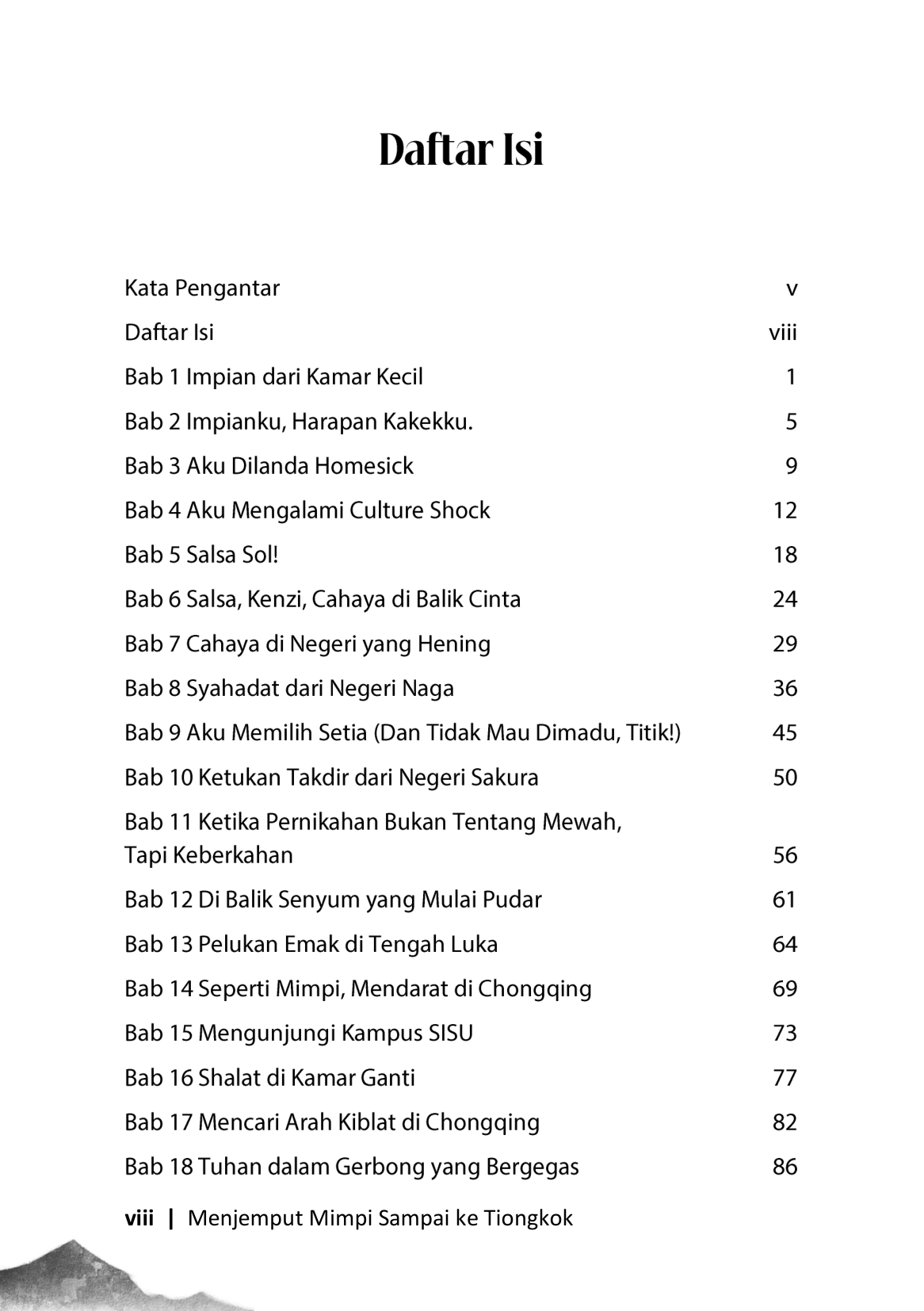 Novel ini menyoroti perjuangan, ketekunan, dan keberanian untuk melangkah keluar dari batasan, sekaligus menggambarkan keindahan Tiongkok — dari kampus yang sibuk, kota-kota yang ramai, hingga pemandangan alam yang menakjubkan. Perjalanan Salsa bukan sekadar tentang akademik, tetapi juga tentang menemukan kekuatan batin, arti persahabatan, dan makna sejati dari mimpi yang diperjuangkan.