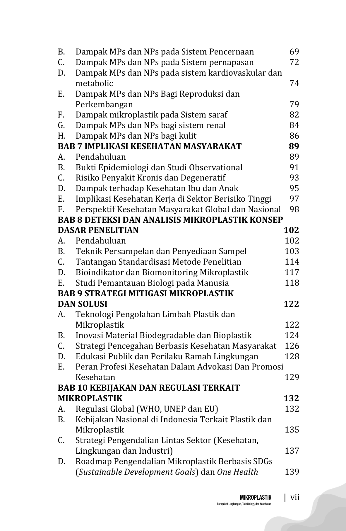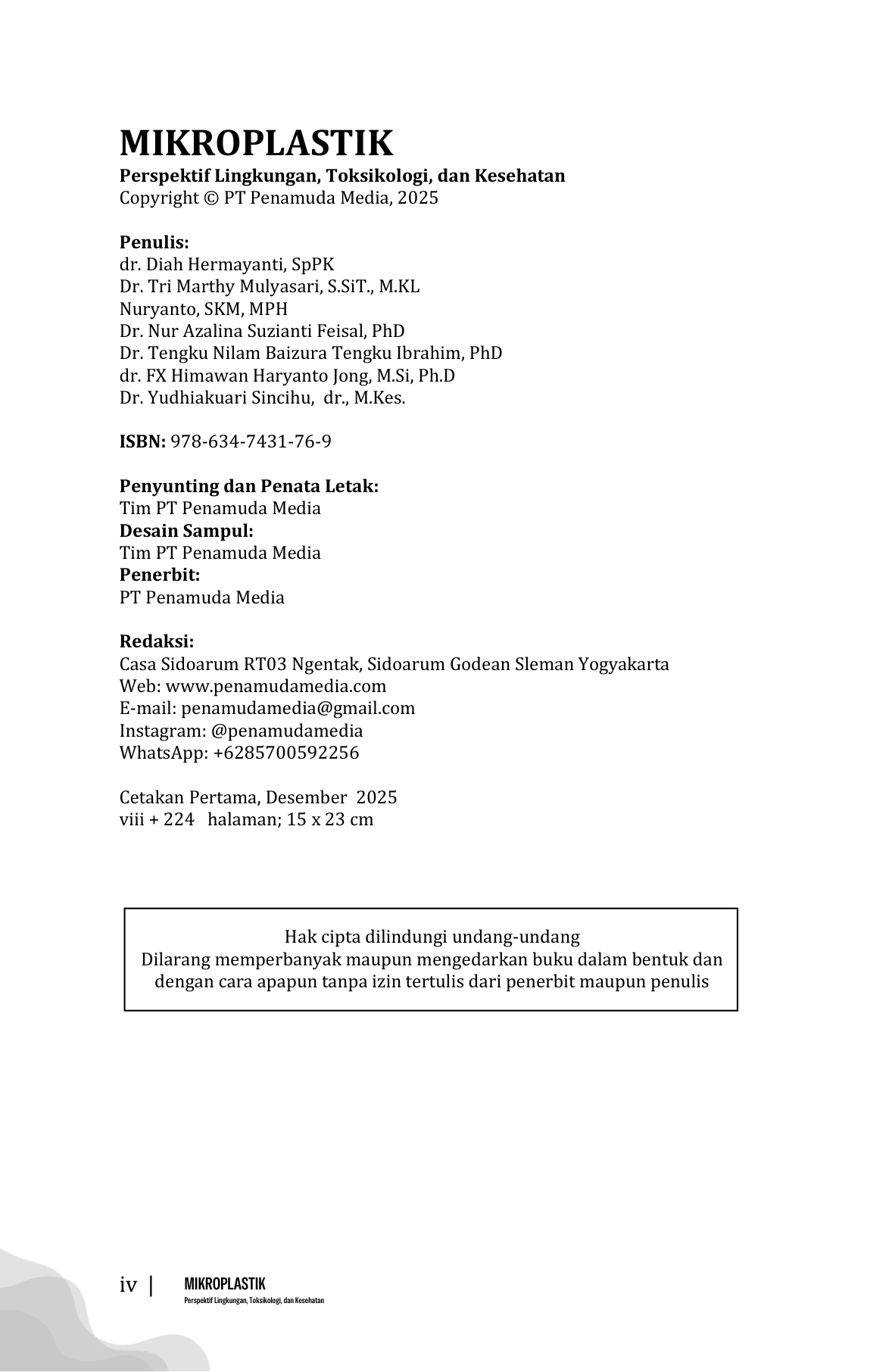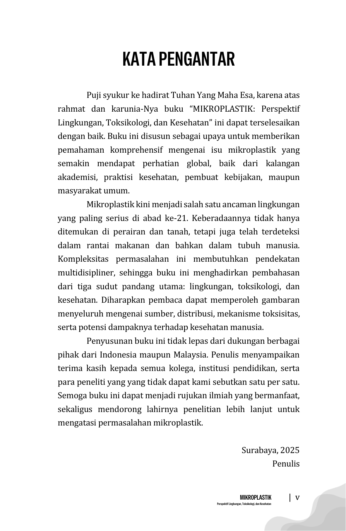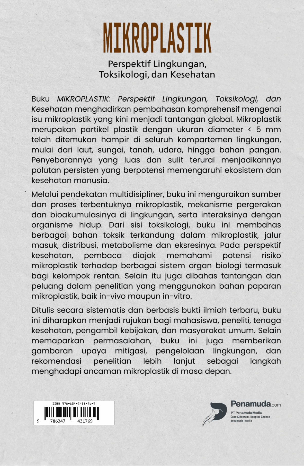 Buku MIKROPLASTIK: Perspektif Lingkungan, Toksikologi, dan Kesehatan menghadirkan pembahasan komprehensif mengenai isu mikroplastik yang kini menjadi tantangan global. Mikroplastik merupakan partikel plastik dengan ukuran diameter < 5 mm telah ditemukan hampir di seluruh kompartemen lingkungan, mulai dari laut, sungai, tanah, udara, hingga bahan pangan. Penyebarannya yang luas dan sulit terurai menjadikannya polutan persisten yang berpotensi memengaruhi ekosistem dan kesehatan manusia. Melalui pendekatan multidisipliner, buku ini menguraikan sumber dan proses terbentuknya mikroplastik, mekanisme pergerakan dan bioakumulasinya di lingkungan, serta interaksinya dengan organisme hidup. Dari sisi toksikologi, buku ini membahas berbagai bahan toksik terkandung dalam mikroplastik, jalur masuk, distribusi, metabolisme dan eksresinya. Pada perspektif kesehatan, pembaca diajak memahami potensi risiko mikroplastik terhadap berbagai sistem organ biologi termasuk bagi kelompok rentan. Selain itu juga dibahas tantangan dan peluang dalam penelitian yang menggunakan bahan paparan mikroplastik, baik in-vivo maupun in-vitro. Ditulis secara sistematis dan berbasis bukti ilmiah terbaru, buku ini diharapkan menjadi rujukan bagi mahasiswa, peneliti, tenaga kesehatan, pengambil kebijakan, dan masyarakat umum. Selain memaparkan permasalahan, buku ini juga memberikan gambaran upaya mitigasi, pengelolaan lingkungan, dan rekomendasi penelitian lebih lanjut sebagai langkah menghadapi ancaman mikroplastik di masa depan.