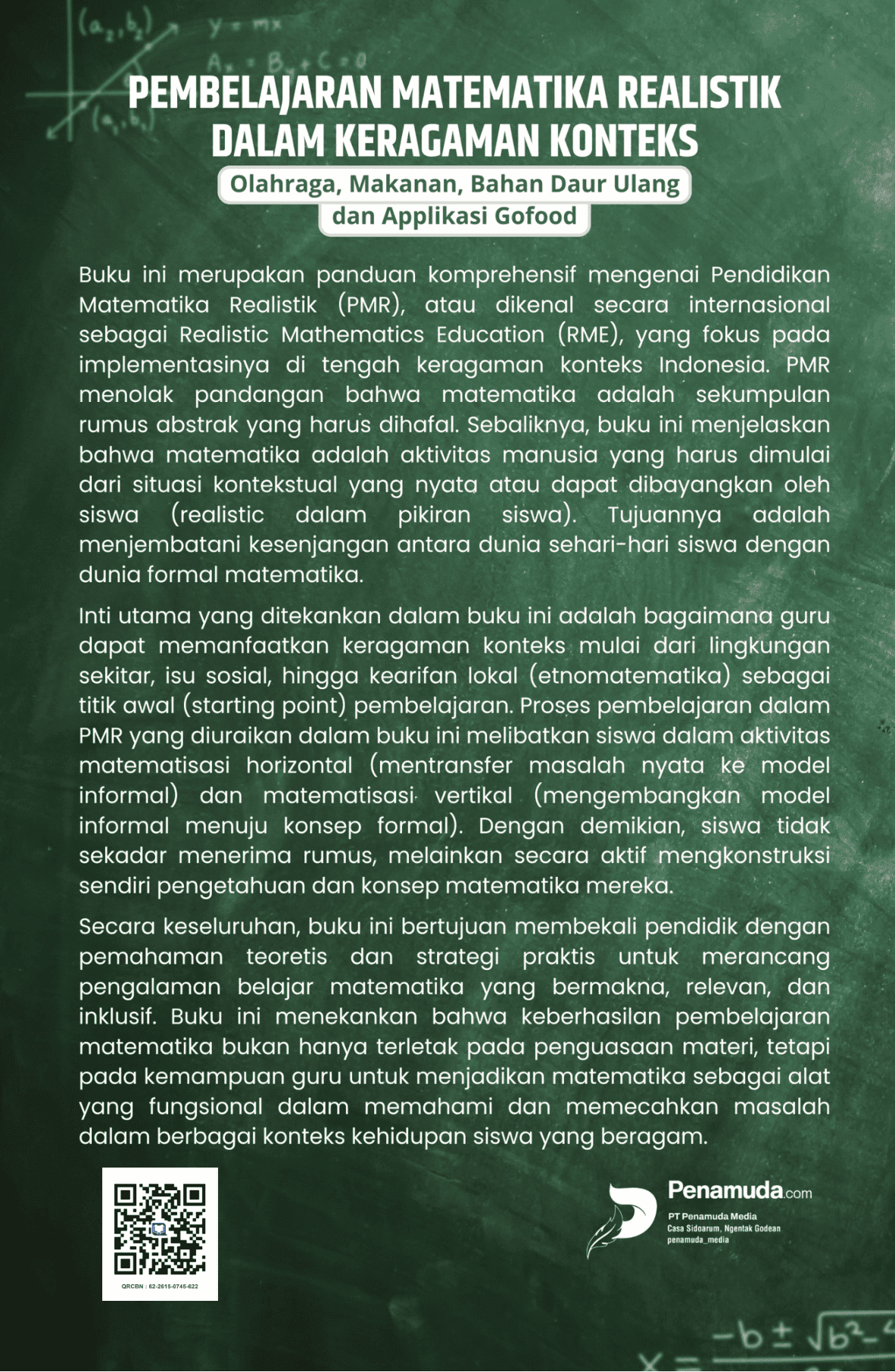 Buku ini merupakan panduan komprehensif mengenai Pendidikan Matematika Realistik (PMR), atau dikenal secara internasional sebagai Realistic Mathematics Education (RME), yang fokus pada implementasinya di tengah keragaman konteks Indonesia. PMR menolak pandangan bahwa matematika adalah sekumpulan rumus abstrak yang harus dihafal. Sebaliknya, buku ini menjelaskan bahwa matematika adalah aktivitas manusia yang harus dimulai dari situasi kontekstual yang nyata atau dapat dibayangkan oleh siswa (realistic dalam pikiran siswa). Tujuannya adalah menjembatani kesenjangan antara dunia sehari-hari siswa dengan dunia formal matematika. Inti utama yang ditekankan dalam buku ini adalah bagaimana guru dapat memanfaatkan keragaman konteks mulai dari lingkungan sekitar, isu sosial, hingga kearifan lokal (etnomatematika) sebagai titik awal (starting point) pembelajaran. Proses pembelajaran dalam PMR yang diuraikan dalam buku ini melibatkan siswa dalam aktivitas matematisasi horizontal (mentransfer masalah nyata ke model informal) dan matematisasi vertikal (mengembangkan model informal menuju konsep formal). Dengan demikian, siswa tidak sekadar menerima rumus, melainkan secara aktif mengkonstruksi sendiri pengetahuan dan konsep matematika mereka. Secara keseluruhan, buku ini bertujuan membekali pendidik dengan pemahaman teoretis dan strategi praktis untuk merancang pengalaman belajar matematika yang bermakna, relevan, dan inklusif. Buku ini menekankan bahwa keberhasilan pembelajaran matematika bukan hanya terletak pada penguasaan materi, tetapi pada kemampuan guru untuk menjadikan matematika sebagai alat yang fungsional dalam memahami dan memecahkan masalah dalam berbagai konteks kehidupan siswa yang beragam.