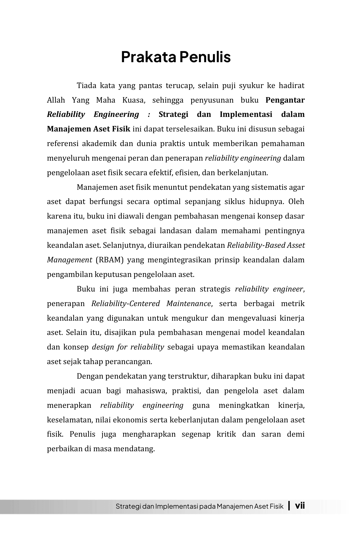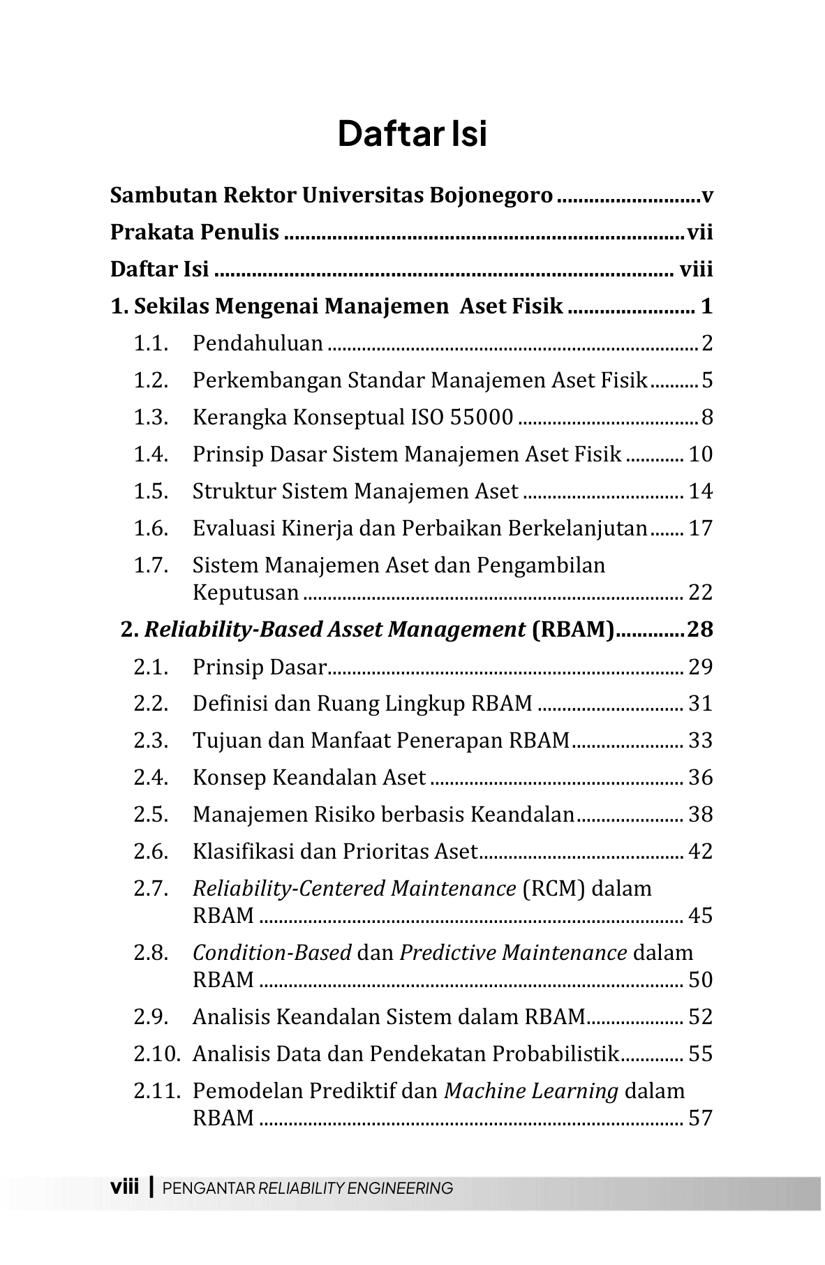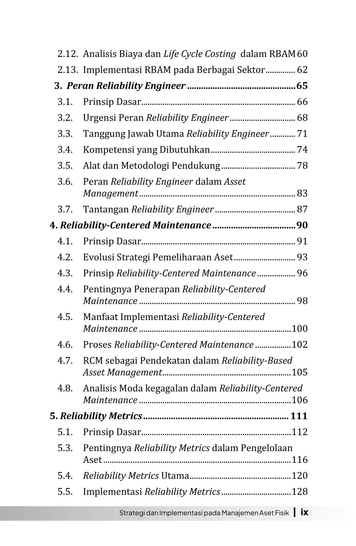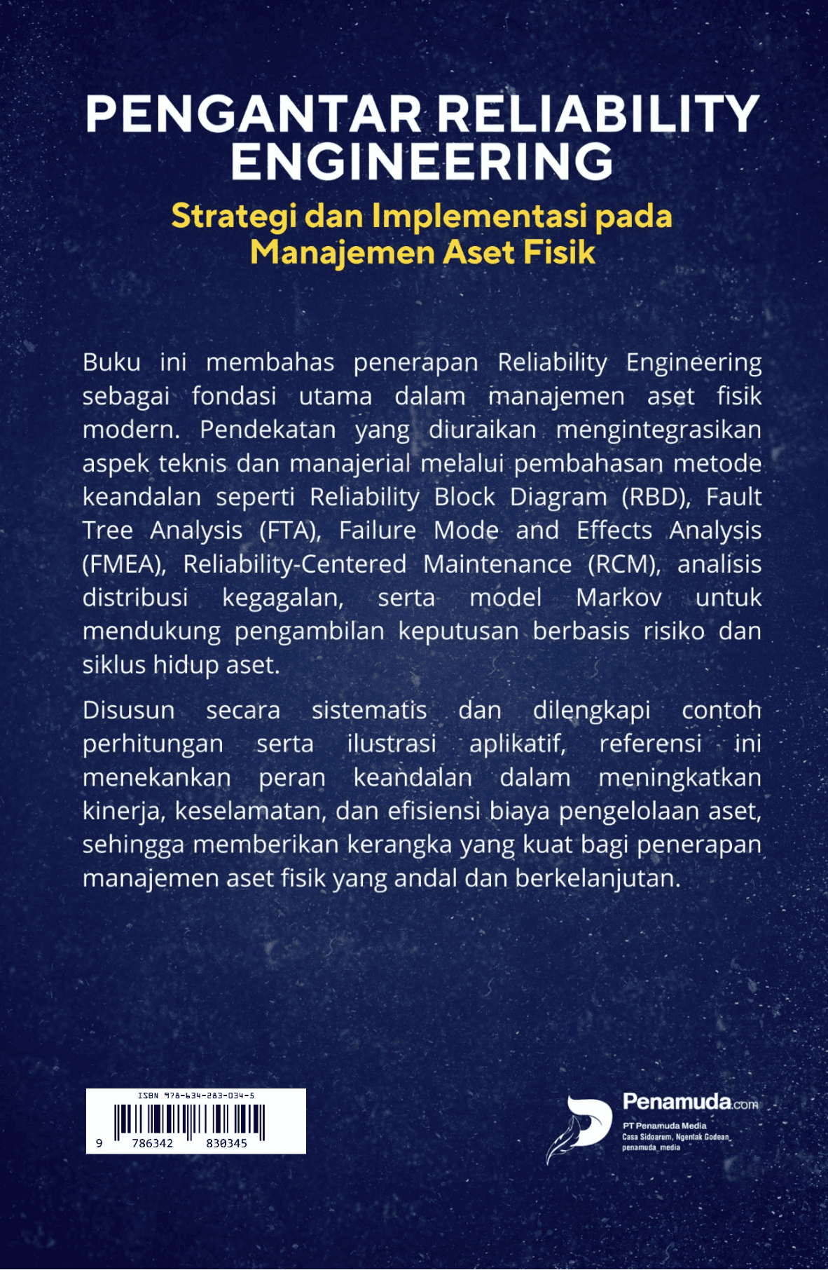 Buku ini membahas penerapan Reliability Engineering sebagai fondasi utama dalam manajemen aset fisik modern. Pendekatan yang diuraikan mengintegrasikan aspek teknis dan manajerial melalui pembahasan metode keandalan seperti Reliability Block Diagram (RBD), Fault Tree Analysis (FTA), Failure Mode and Effects Analysis (FMEA), Reliability-Centered Maintenance (RCM), analisis distribusi kegagalan, serta model Markov untuk mendukung pengambilan keputusan berbasis risiko dan siklus hidup aset. Disusun secara sistematis dan dilengkapi contoh perhitungan serta ilustrasi aplikatif, referensi ini menekankan peran keandalan dalam meningkatkan kinerja, keselamatan, dan efisiensi biaya pengelolaan aset, sehingga memberikan kerangka yang kuat bagi penerapan manajemen aset fisik yang andal dan berkelanjutan.