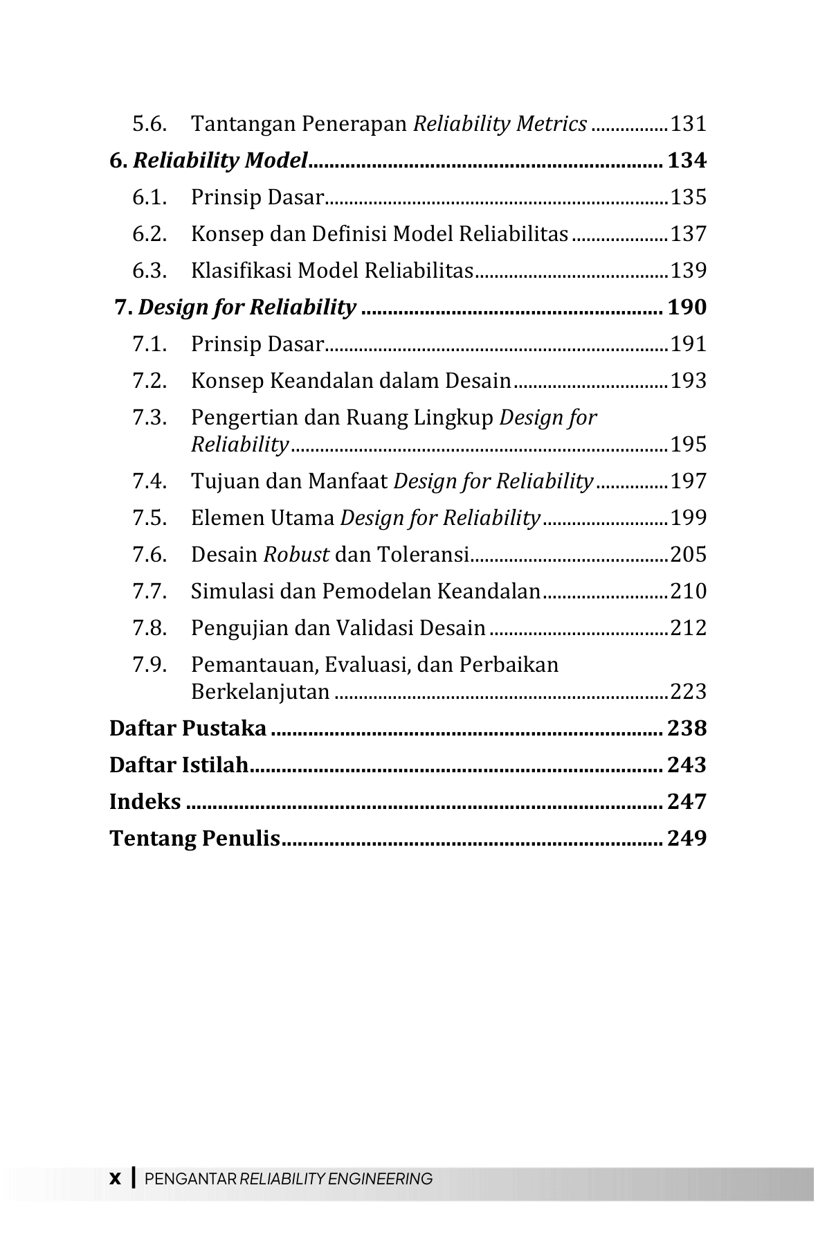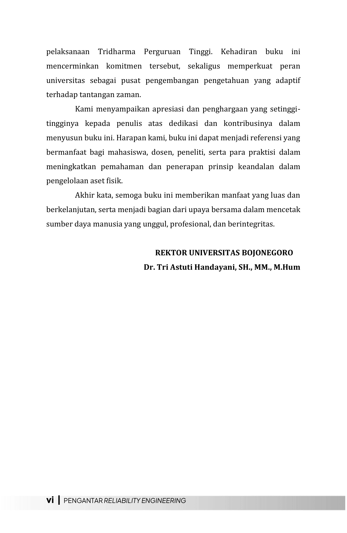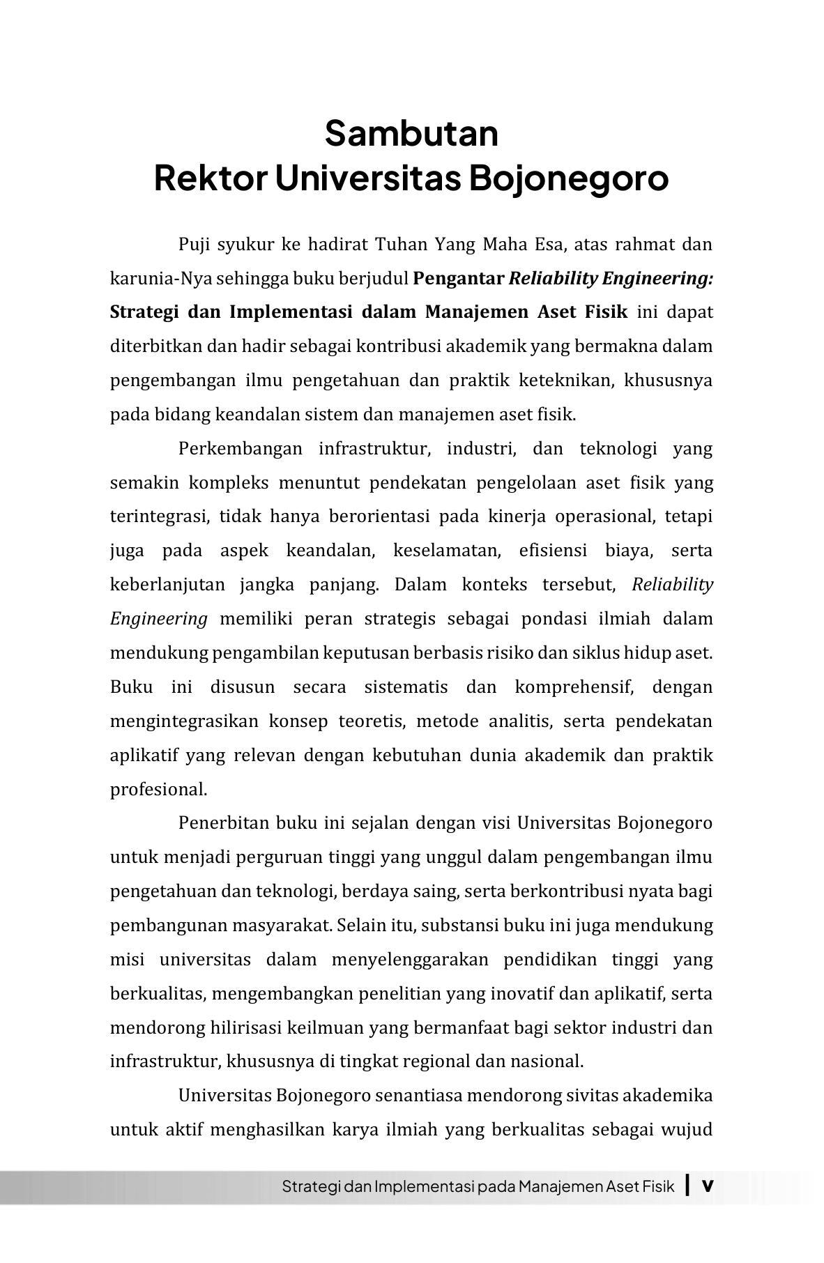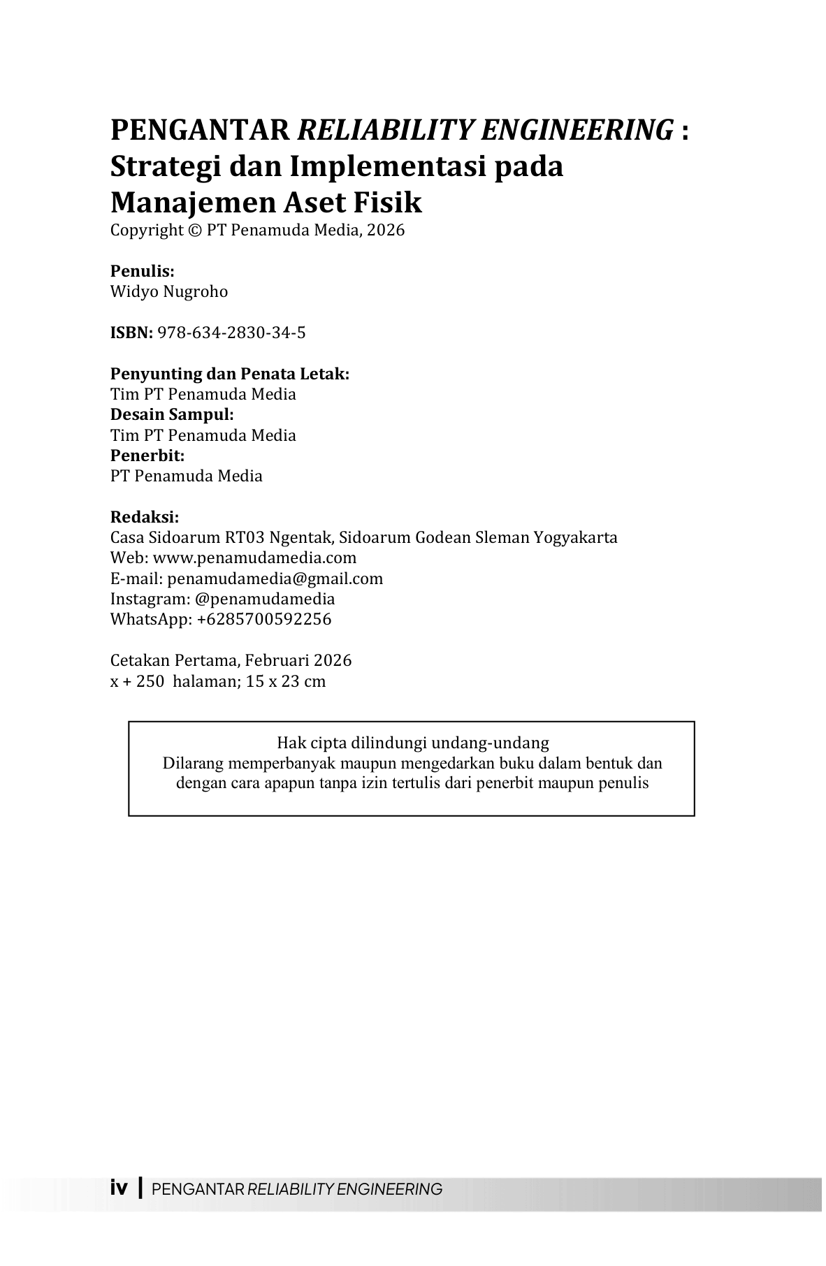 Buku ini membahas penerapan Reliability Engineering sebagai fondasi utama dalam manajemen aset fisik modern. Pendekatan yang diuraikan mengintegrasikan aspek teknis dan manajerial melalui pembahasan metode keandalan seperti Reliability Block Diagram (RBD), Fault Tree Analysis (FTA), Failure Mode and Effects Analysis (FMEA), Reliability-Centered Maintenance (RCM), analisis distribusi kegagalan, serta model Markov untuk mendukung pengambilan keputusan berbasis risiko dan siklus hidup aset. Disusun secara sistematis dan dilengkapi contoh perhitungan serta ilustrasi aplikatif, referensi ini menekankan peran keandalan dalam meningkatkan kinerja, keselamatan, dan efisiensi biaya pengelolaan aset, sehingga memberikan kerangka yang kuat bagi penerapan manajemen aset fisik yang andal dan berkelanjutan.