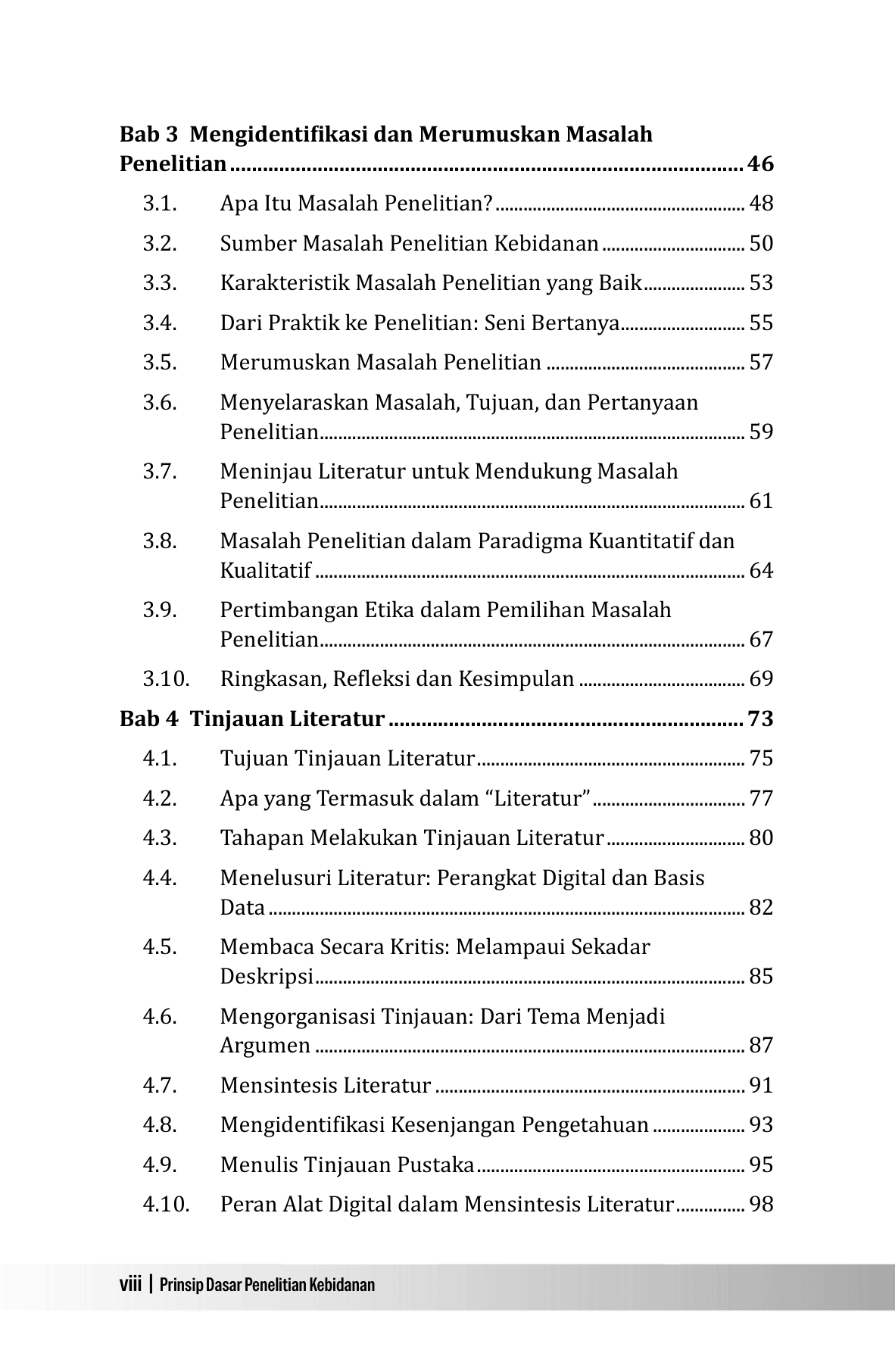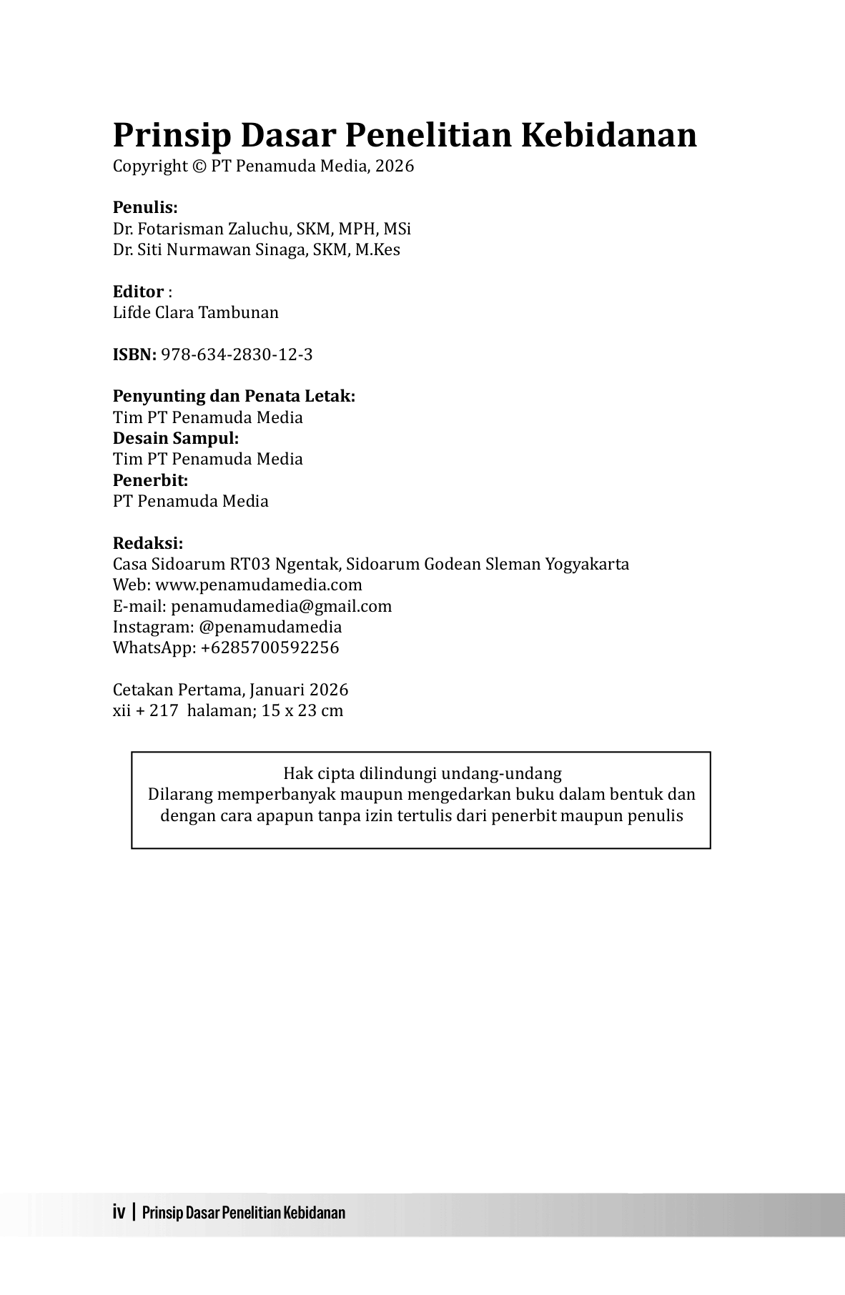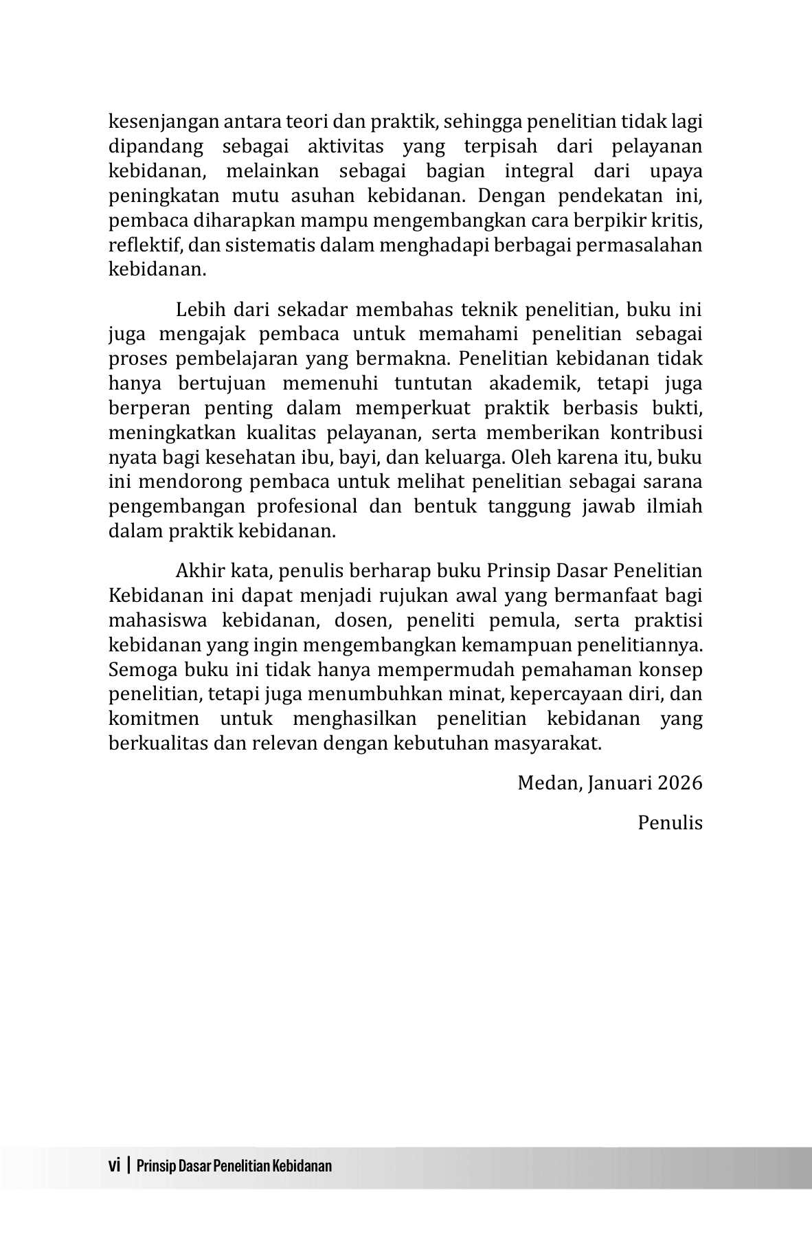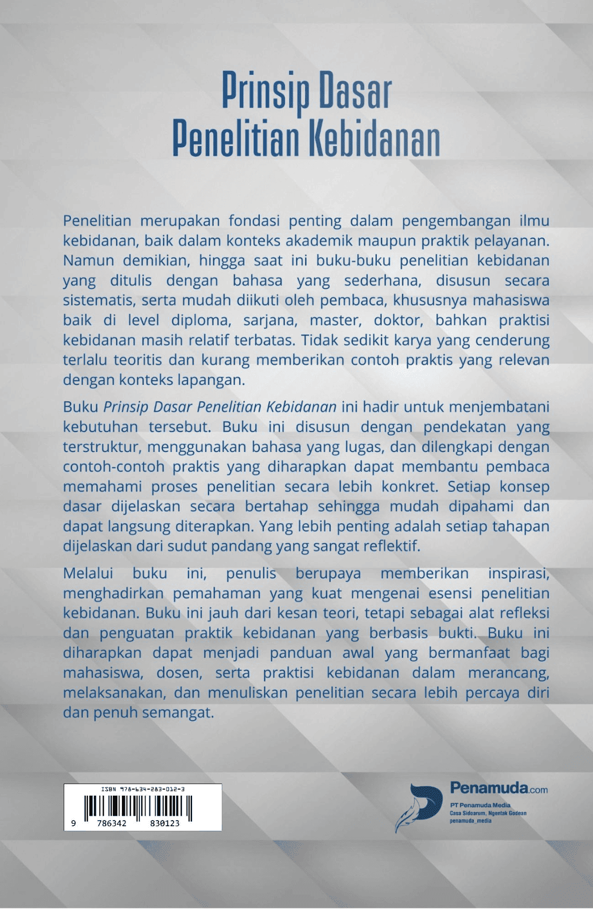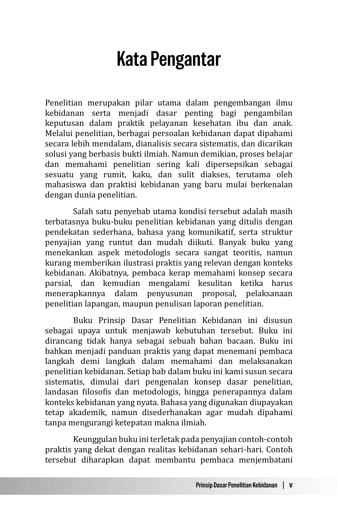 Penelitian merupakan fondasi penting dalam pengembangan ilmu kebidanan, baik dalam konteks akademik maupun praktik pelayanan. Namun demikian, hingga saat ini buku-buku penelitian kebidanan yang ditulis dengan bahasa yang sederhana, disusun secara sistematis, serta mudah diikuti oleh pembaca, khususnya mahasiswa baik di level diploma, sarjana, master, doktor, bahkan praktisi kebidanan masih relatif terbatas. Tidak sedikit karya yang cenderung terlalu teoritis dan kurang memberikan contoh praktis yang relevan dengan konteks lapangan. Buku Prinsip Dasar Penelitian Kebidanan ini hadir untuk menjembatani kebutuhan tersebut. Buku ini disusun dengan pendekatan yang terstruktur, menggunakan bahasa yang lugas, dan dilengkapi dengan contoh-contoh praktis yang diharapkan dapat membantu pembaca memahami proses penelitian secara lebih konkret. Setiap konsep dasar dijelaskan secara bertahap sehingga mudah dipahami dan dapat langsung diterapkan. Yang lebih penting adalah setiap tahapan dijelaskan dari sudut pandang yang sangat reflektif . Melalui buku ini, penulis berupaya memberikan inspirasi, menghadirkan pemahaman yang kuat mengenai esensi penelitian kebidanan. Buku ini jauh dari kesan teori, tetapi sebagai alat refleksi dan penguatan praktik kebidanan yang berbasis bukti. Buku ini diharapkan dapat menjadi panduan awal yang bermanfaat bagi mahasiswa, dosen, serta praktisi kebidanan dalam merancang, melaksanakan, dan menuliskan penelitian secara lebih percaya diri dan penuh semangat.