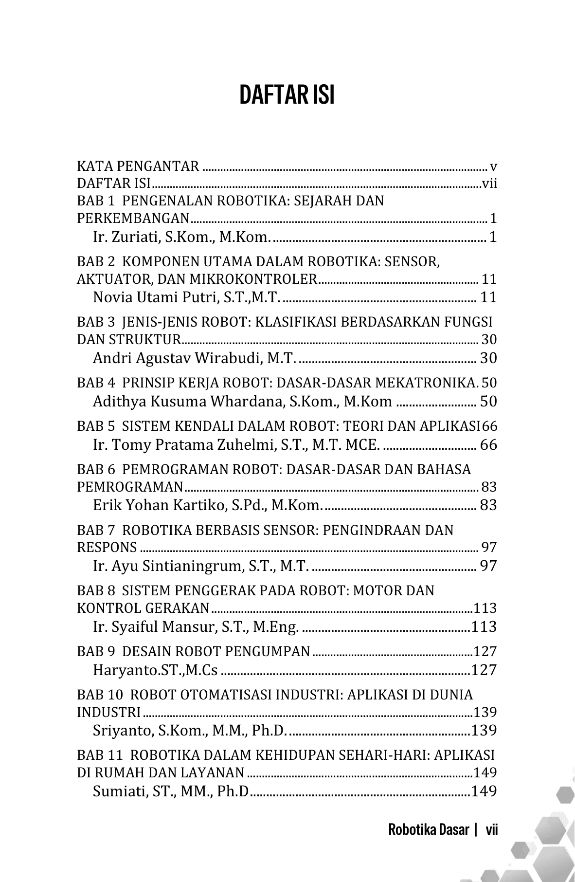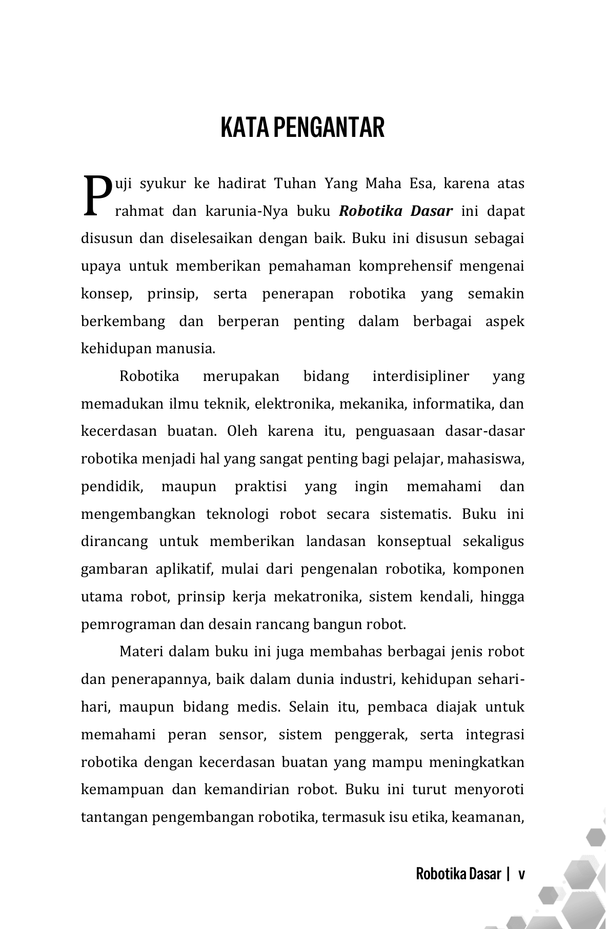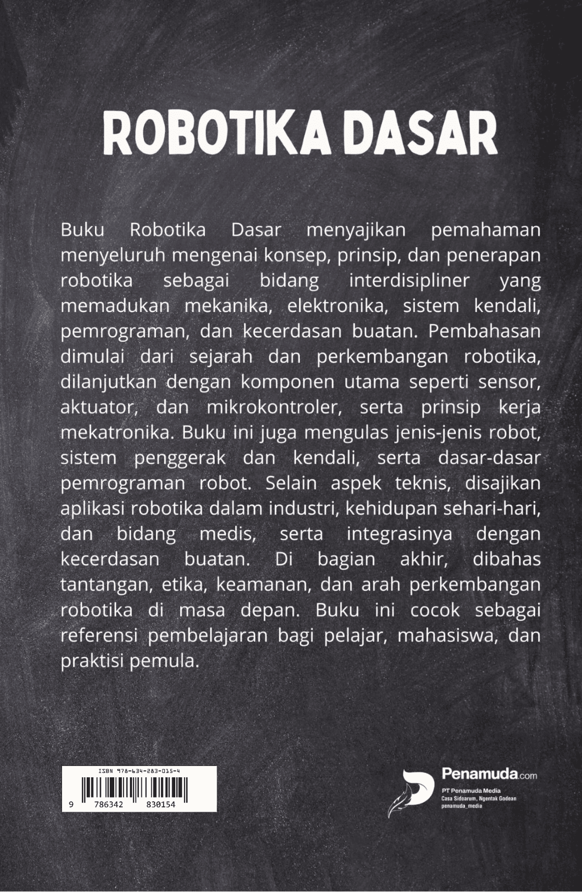 Buku Robotika Dasar menyajikan pemahaman menyeluruh mengenai konsep, prinsip, dan penerapan robotika sebagai bidang interdisipliner yang memadukan mekanika, elektronika, sistem kendali, pemrograman, dan kecerdasan buatan. Pembahasan dimulai dari sejarah dan perkembangan robotika, dilanjutkan dengan komponen utama seperti sensor, aktuator, dan mikrokontroler, serta prinsip kerja mekatronika. Buku ini juga mengulas jenis-jenis robot, sistem penggerak dan kendali, serta dasar-dasar pemrograman robot. Selain aspek teknis, disajikan aplikasi robotika dalam industri, kehidupan sehari-hari, dan bidang medis, serta integrasinya dengan kecerdasan buatan. Di bagian akhir, dibahas tantangan, etika, keamanan, dan arah perkembangan robotika di masa depan. Buku ini cocok sebagai referensi pembelajaran bagi pelajar, mahasiswa, dan praktisi pemula.