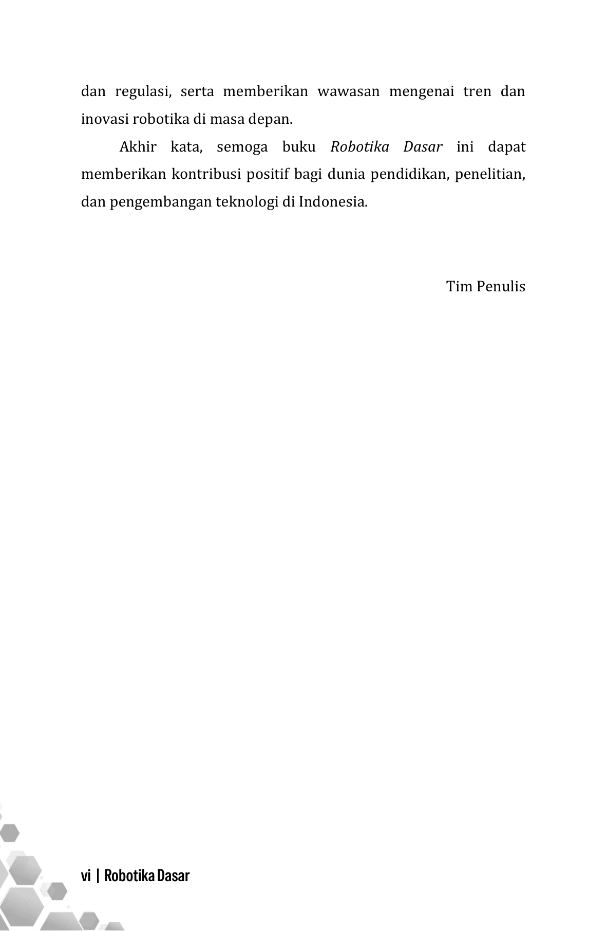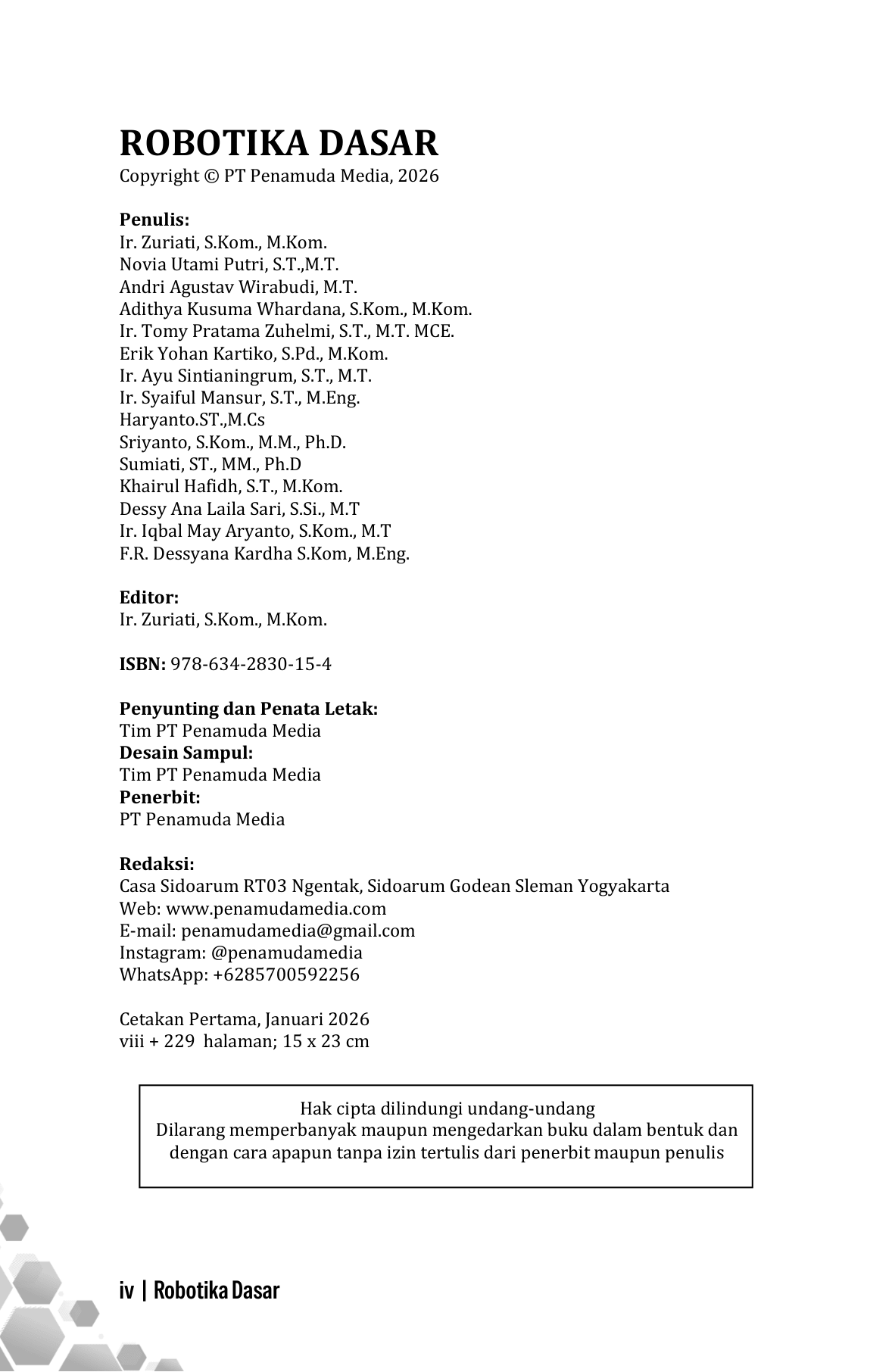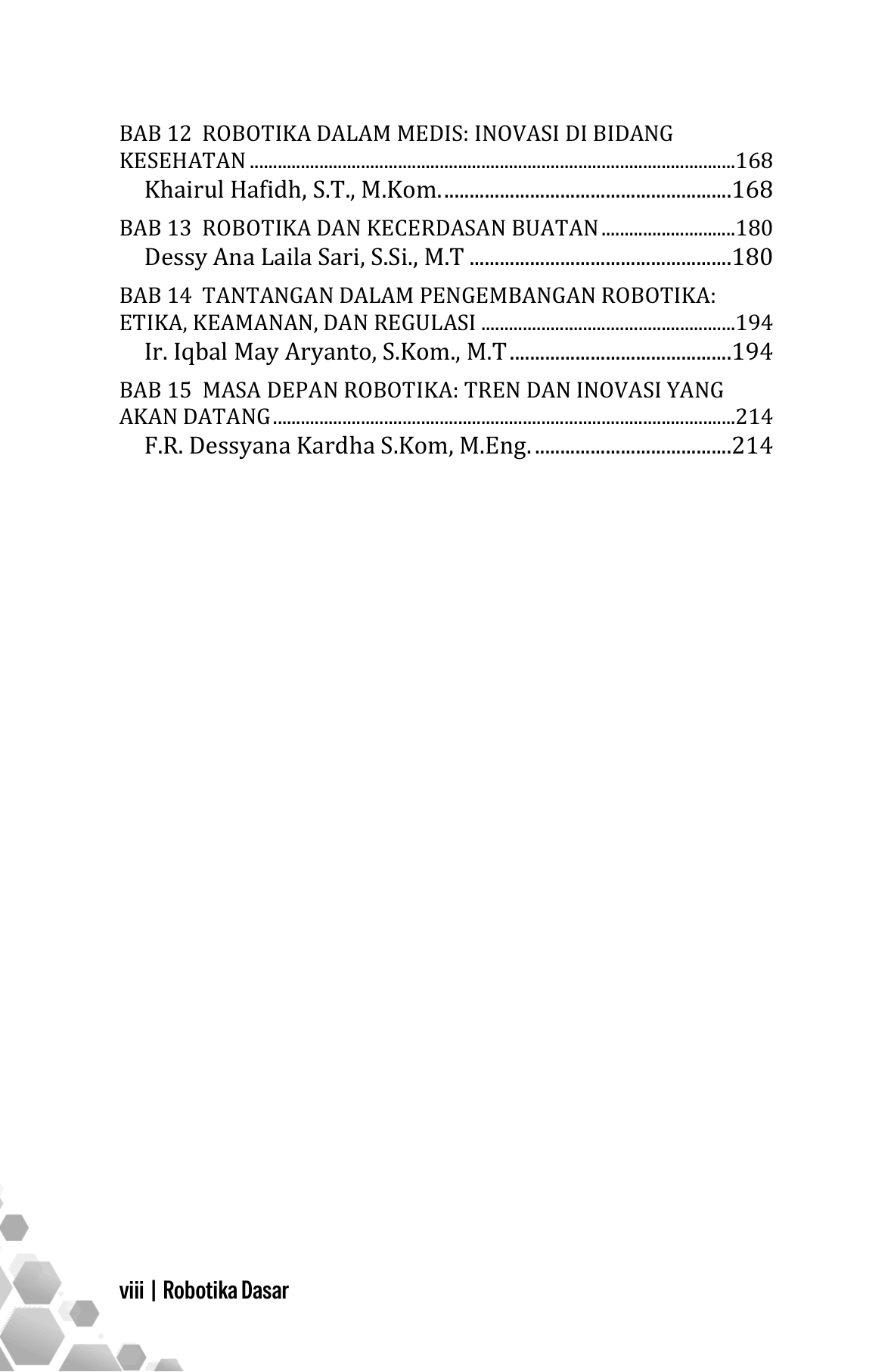 Buku Robotika Dasar menyajikan pemahaman menyeluruh mengenai konsep, prinsip, dan penerapan robotika sebagai bidang interdisipliner yang memadukan mekanika, elektronika, sistem kendali, pemrograman, dan kecerdasan buatan. Pembahasan dimulai dari sejarah dan perkembangan robotika, dilanjutkan dengan komponen utama seperti sensor, aktuator, dan mikrokontroler, serta prinsip kerja mekatronika. Buku ini juga mengulas jenis-jenis robot, sistem penggerak dan kendali, serta dasar-dasar pemrograman robot. Selain aspek teknis, disajikan aplikasi robotika dalam industri, kehidupan sehari-hari, dan bidang medis, serta integrasinya dengan kecerdasan buatan. Di bagian akhir, dibahas tantangan, etika, keamanan, dan arah perkembangan robotika di masa depan. Buku ini cocok sebagai referensi pembelajaran bagi pelajar, mahasiswa, dan praktisi pemula.