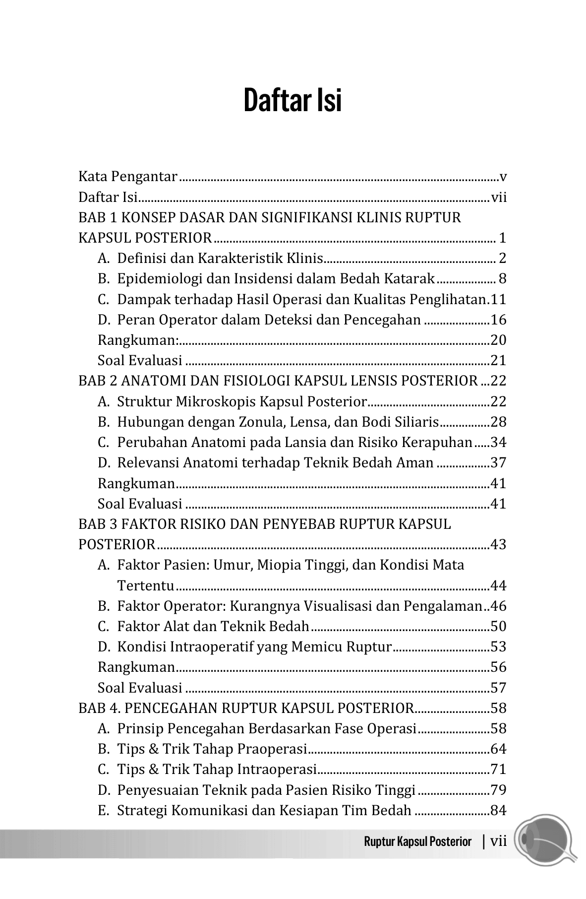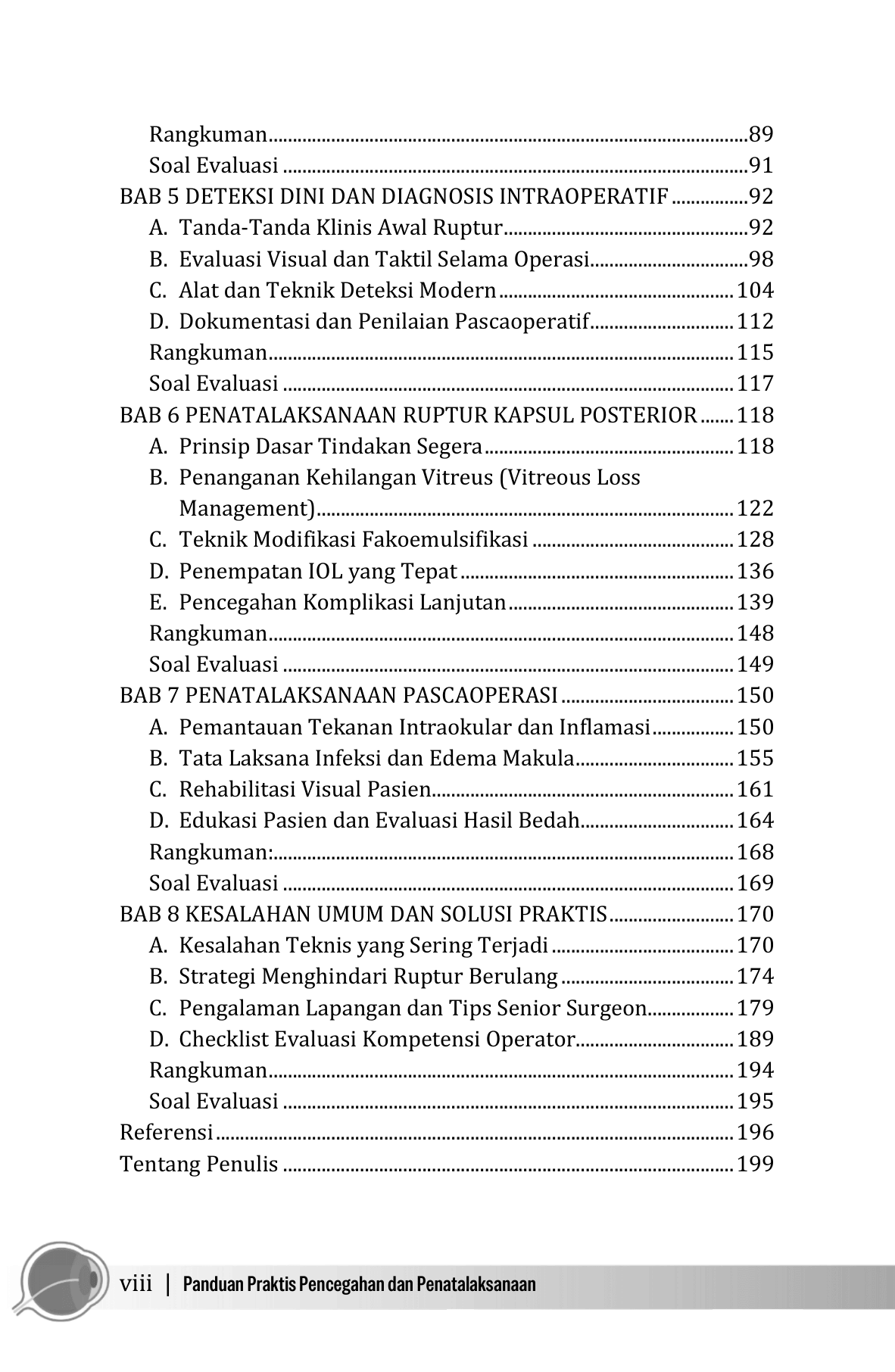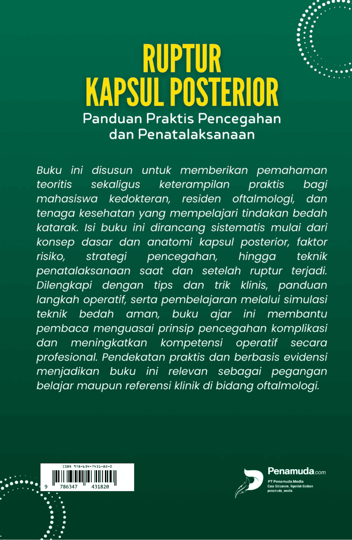 Buku ini disusun untuk memberikan pemahaman teoritis sekaligus keterampilan praktis bagi mahasiswa kedokteran, residen oftalmologi, dan tenaga kesehatan yang mempelajari tindakan bedah katarak. Isi buku ini dirancang sistematis mulai dari konsep dasar dan anatomi kapsul posterior, faktor risiko, strategi pencegahan, hingga teknik penatalaksanaan saat dan setelah ruptur terjadi. Dilengkapi dengan tips dan trik klinis, panduan langkah operatif, serta pembelajaran melalui simulasi teknik bedah aman, buku ajar ini membantu pembaca menguasai prinsip pencegahan komplikasi dan meningkatkan kompetensi operatif secara profesional. Pendekatan praktis dan berbasis evidensi menjadikan buku ini relevan sebagai pegangan belajar maupun referensi klinik di bidang oftalmologi.