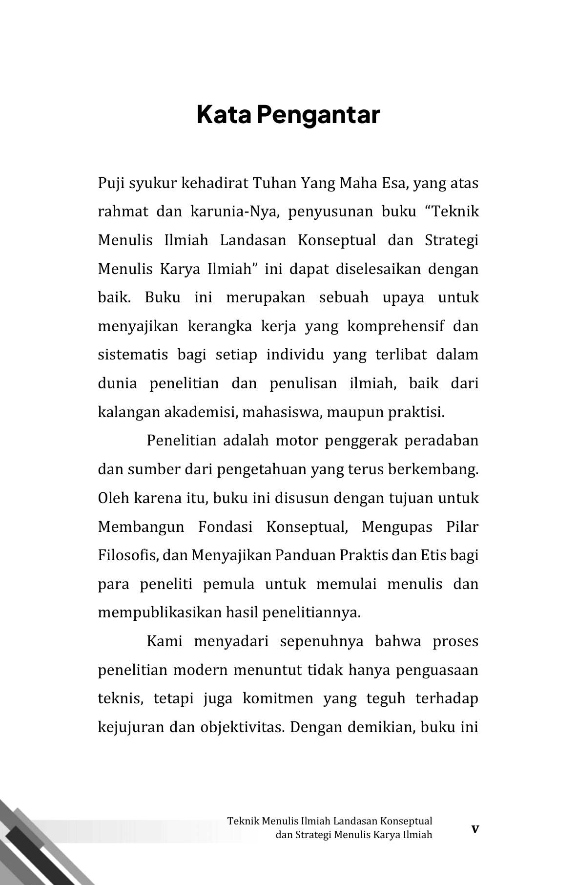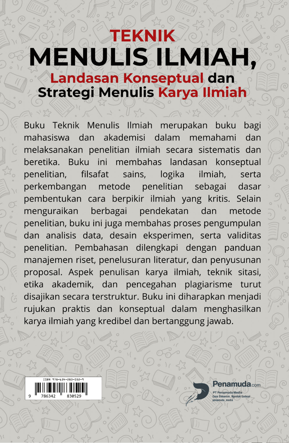 Buku Teknik Menulis Ilmiah merupakan buku bagi mahasiswa dan akademisi dalam memahami dan melaksanakan penelitian ilmiah secara sistematis dan beretika. Buku ini membahas landasan konseptual penelitian, filsafat sains, logika ilmiah, serta perkembangan metode penelitian sebagai dasar pembentukan cara berpikir ilmiah yang kritis. Selain menguraikan berbagai pendekatan dan metode penelitian, buku ini juga membahas proses pengumpulan dan analisis data, desain eksperimen, serta validitas penelitian. Pembahasan dilengkapi dengan panduan manajemen riset, penelusuran literatur, dan penyusunan proposal. Aspek penulisan karya ilmiah, teknik sitasi, etika akademik, dan pencegahan plagiarisme turut disajikan secara terstruktur. Buku ini diharapkan menjadi rujukan praktis dan konseptual dalam menghasilkan karya ilmiah yang kredibel dan bertanggung jawab.